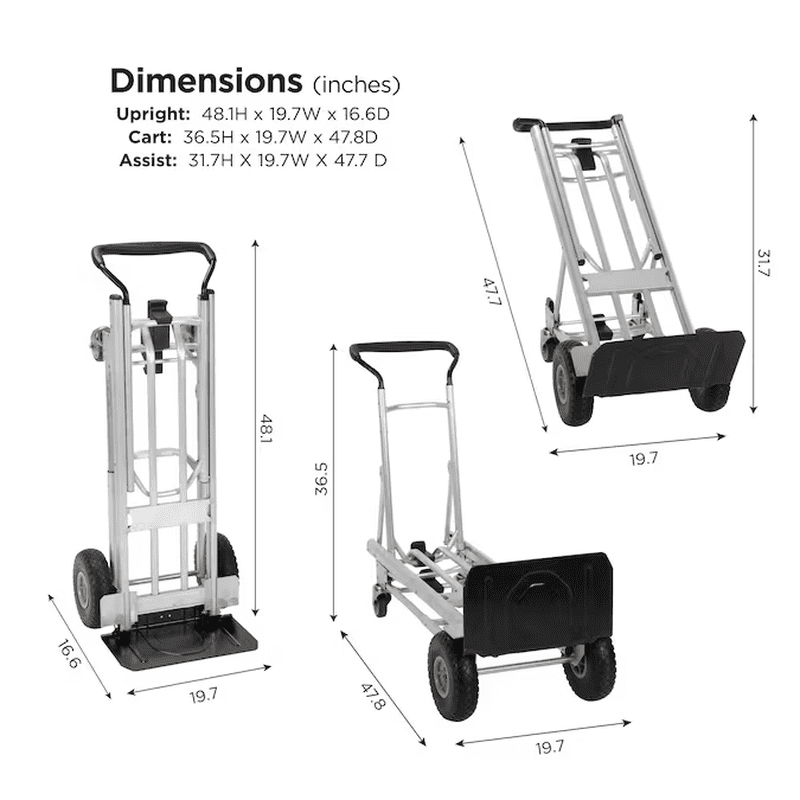 - HEAVY DUTY – 1000 lb load capacity as 4-wheel cart and platform cart, 800 lb load capacity as 2-wheel hand truck and assisted hand truck