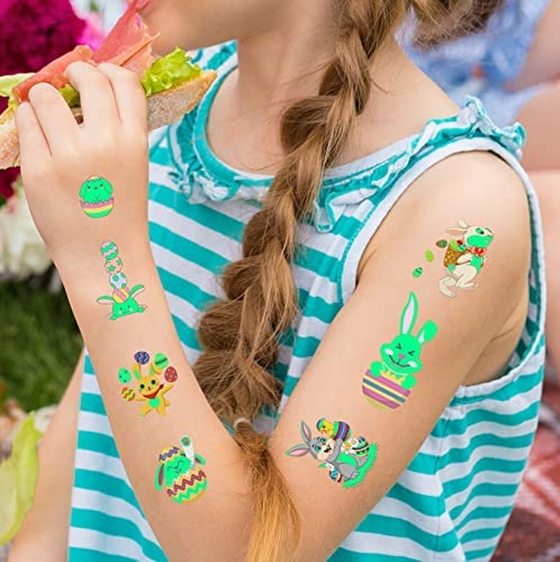 A suit includes 10 sheets 4.72 * 2.99 inch 80 Pcs luminous easter tattoos for kids How to use your temporary tattoo? 1 Decide where you want to apply the tattoo.Make sure your skin clean and dry before application. 2 Cut the tattoo out as close to the edge as possible. 3 Remove the protective transparent sheet and place the design face down onto the desired area. 4 Wet the paper with the wet towel firmly or sponge and wait 30 seconds. 5 Carefully remove the tattoo paper to check if it has transferred,if not press little longer.Be sure not to twist or stretch the skin until the tattoo had time to set. How to remove: When removing the tattoo, you can use alcohol, baby oil or makeup remover, soak the temporary tattoo for a few minutes, and then gently wipe it until it is removed. Note: It is not suitable for sensitive skin or skin allergic to adhesives. If you feel unwell, please stop using temporary tattoos immediately. Prompt: We recommend that you clean the place where you want to stick the tattoo to make it more realistic. If you lightly apply baby powder on the tattoo area with a makeup brush, the temporary tattoo will last longer. Avoid rubbing or scrubbing the tattoo area when taking a bath, otherwise the tattoo will fall off quickly, shortening the use time.
