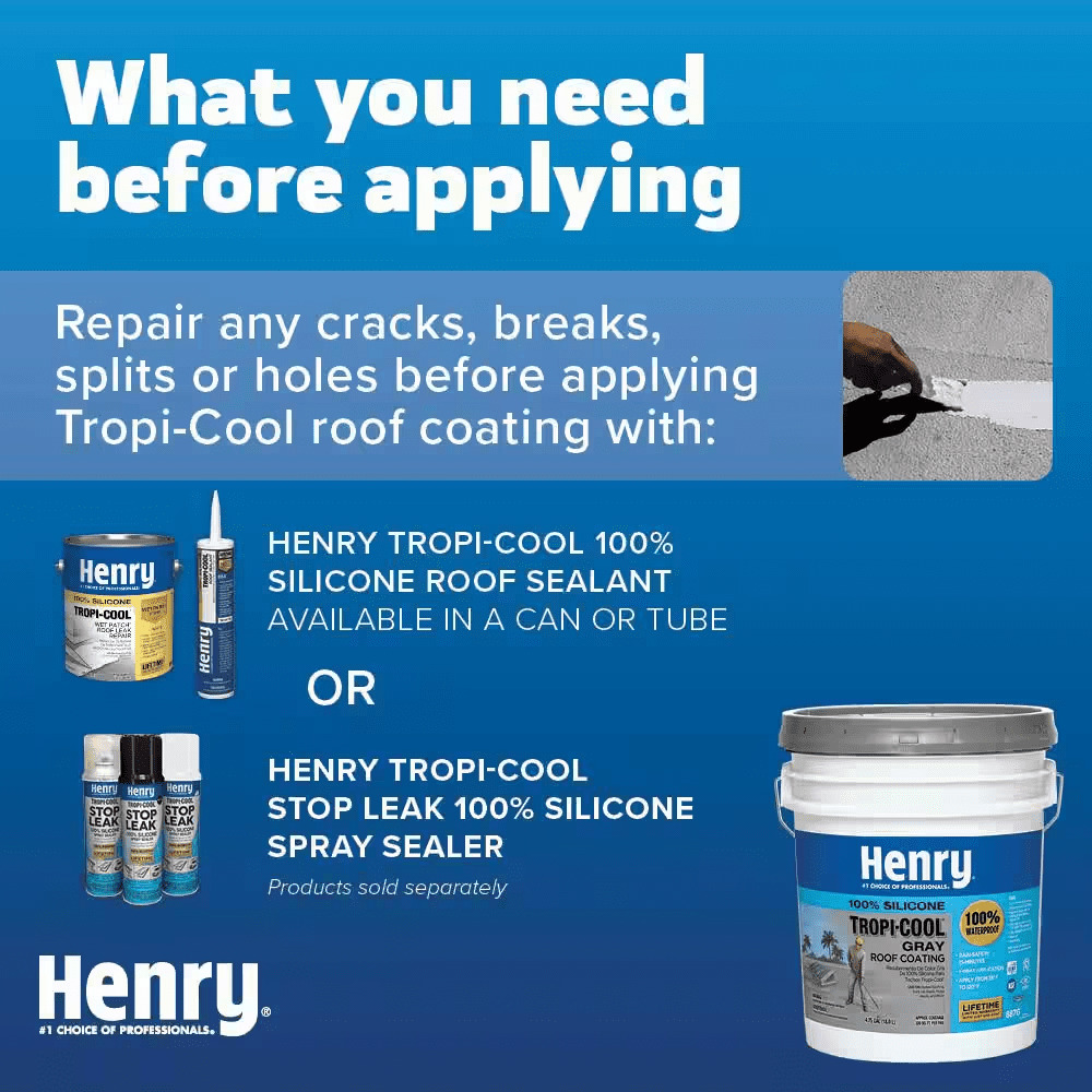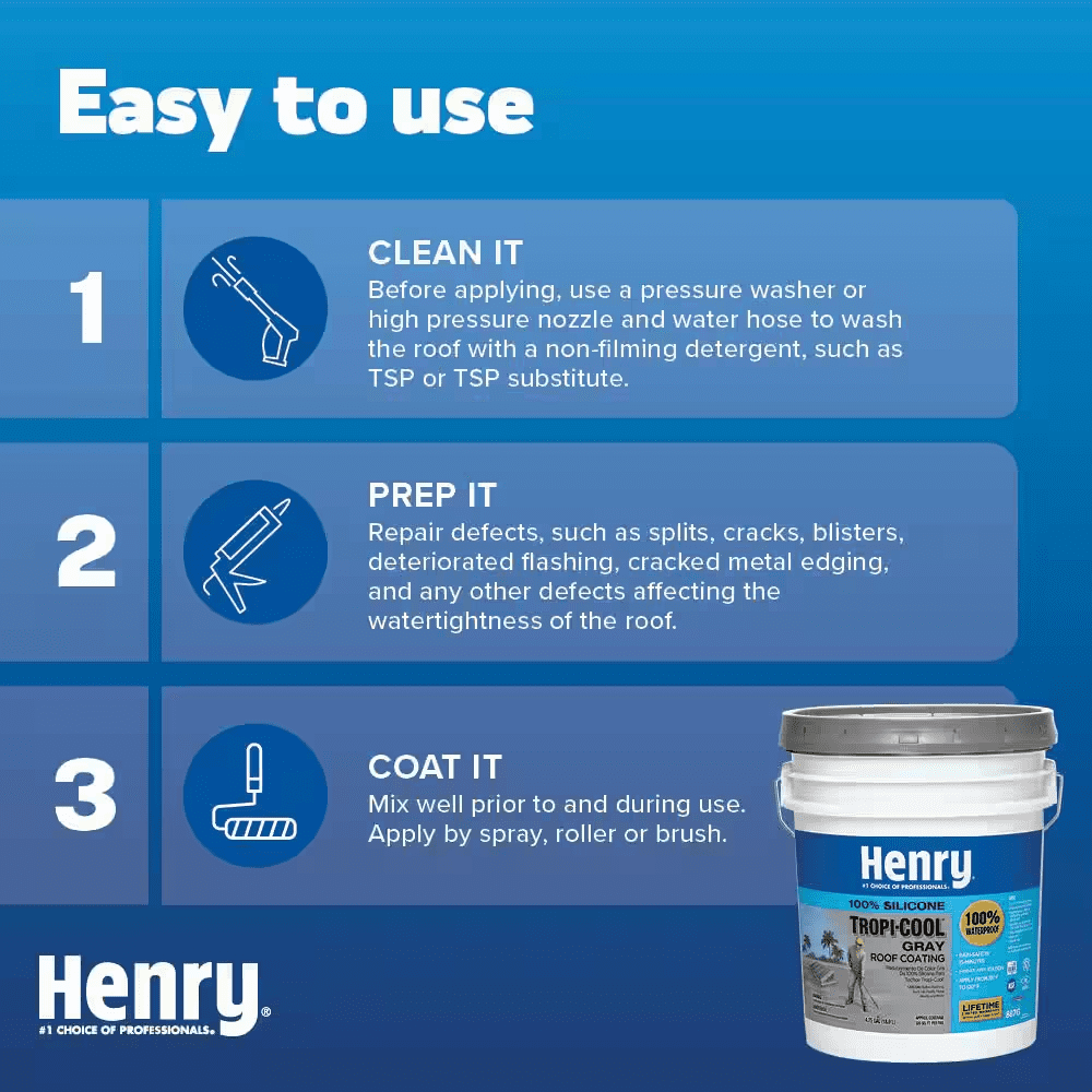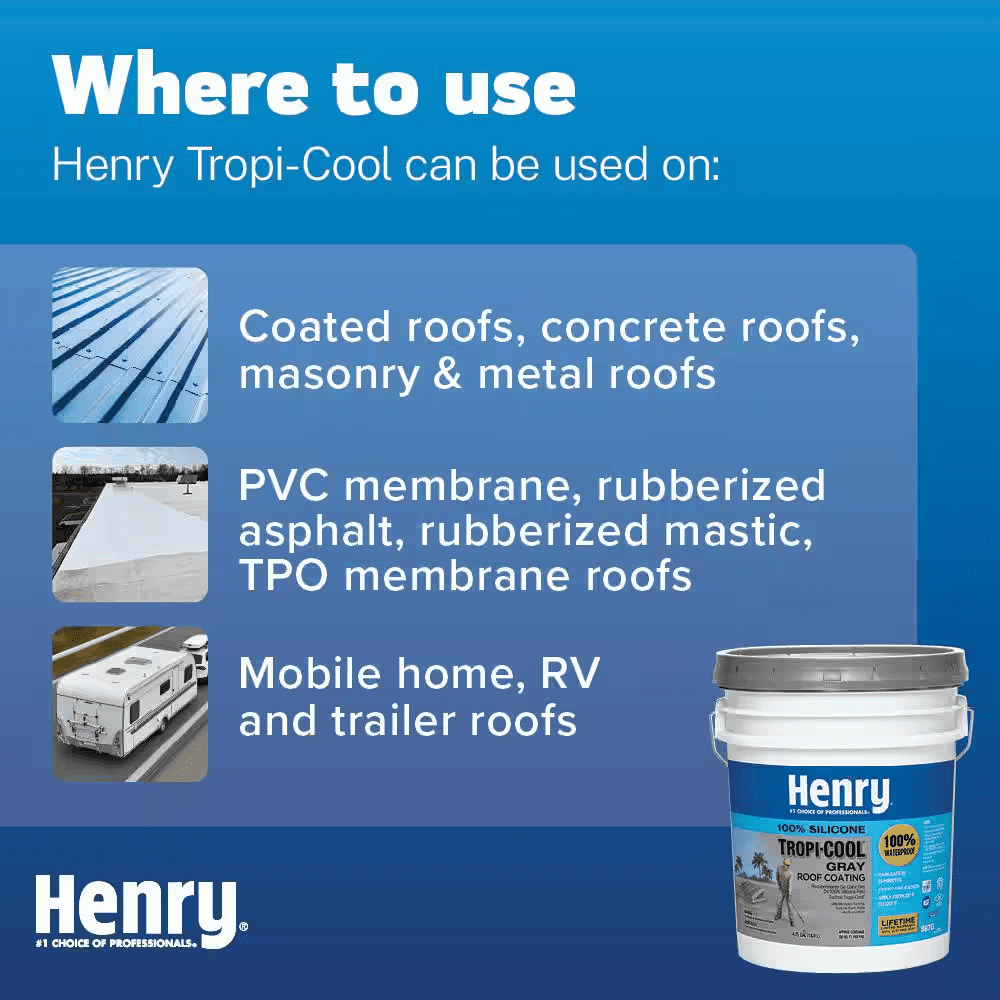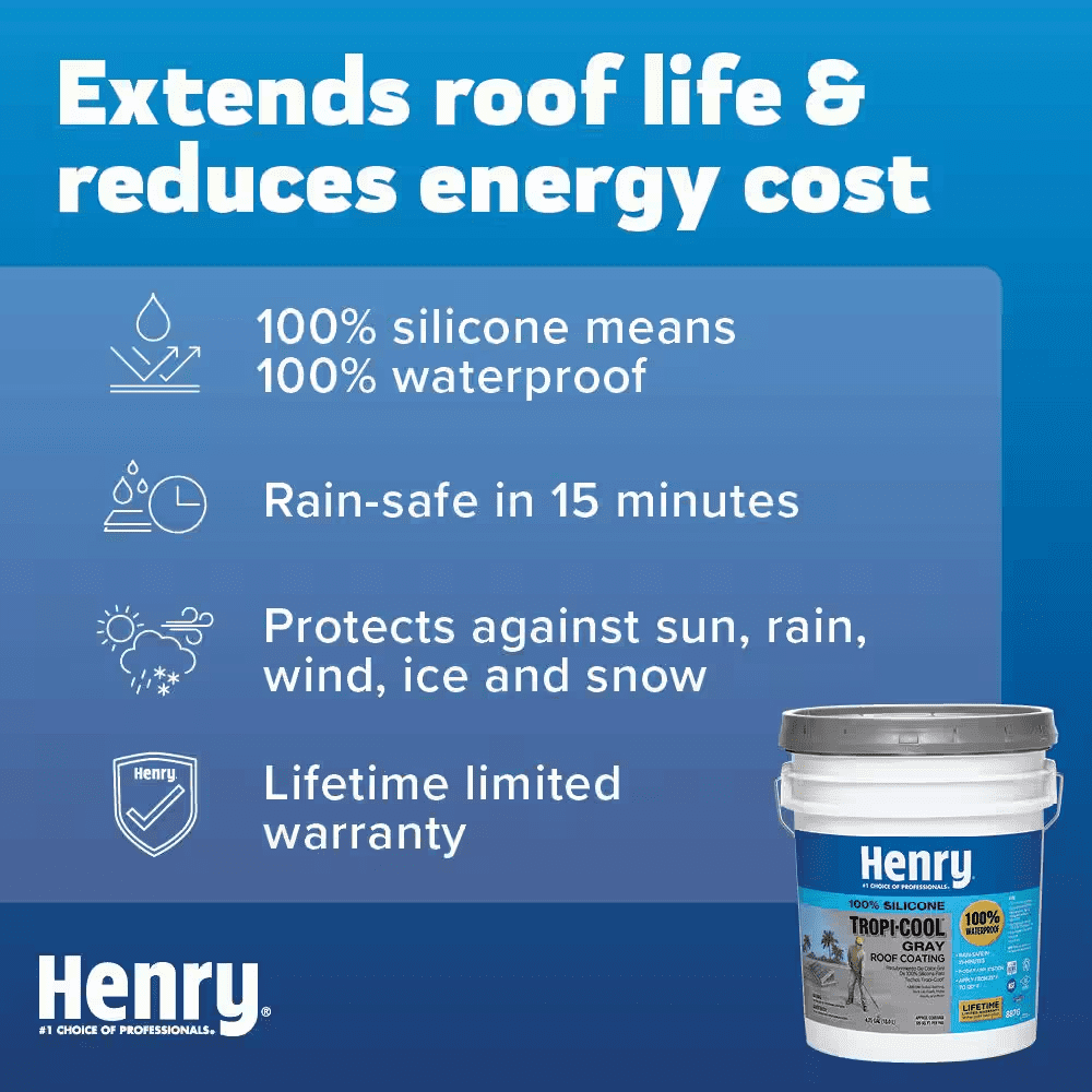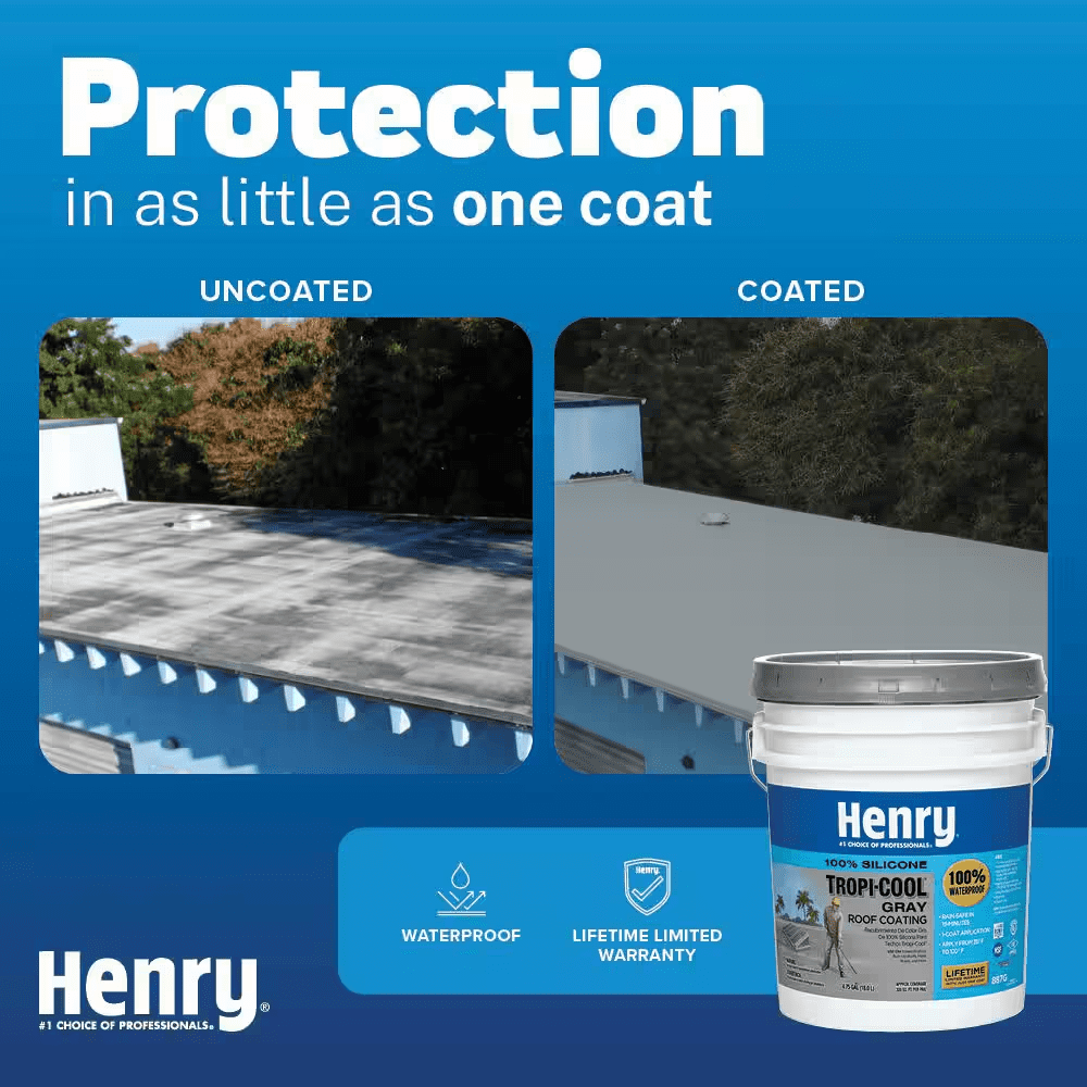 Henry 887 Tropi-Cool 100% Silicone Gray Roof Coating is a premium, 100% silicone, moisture-cure coating designed to reflect the sun’s heat and UV rays as well as protect many types of roofs. While suitable for use in all climates, the 100% silicone chemistry is especially suited for extreme tropical environments, which are exposed to some of the hottest and wettest weather with intense UV exposure. It is specially designed to maintain maximum reflectivity of heat and UV rays as it ages. Its moisture-cure chemistry creates a very aggressive chemical bond with the roof, which allows for permanent ponding water resistance, extreme durability, and superior capabilities of sealing and protection.