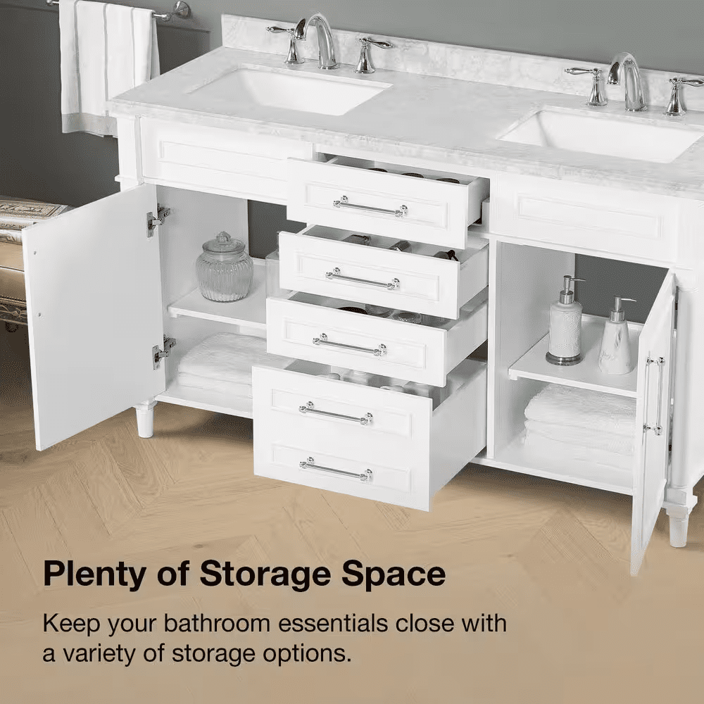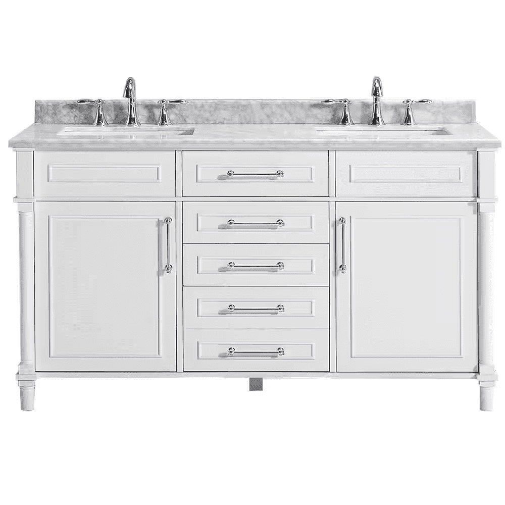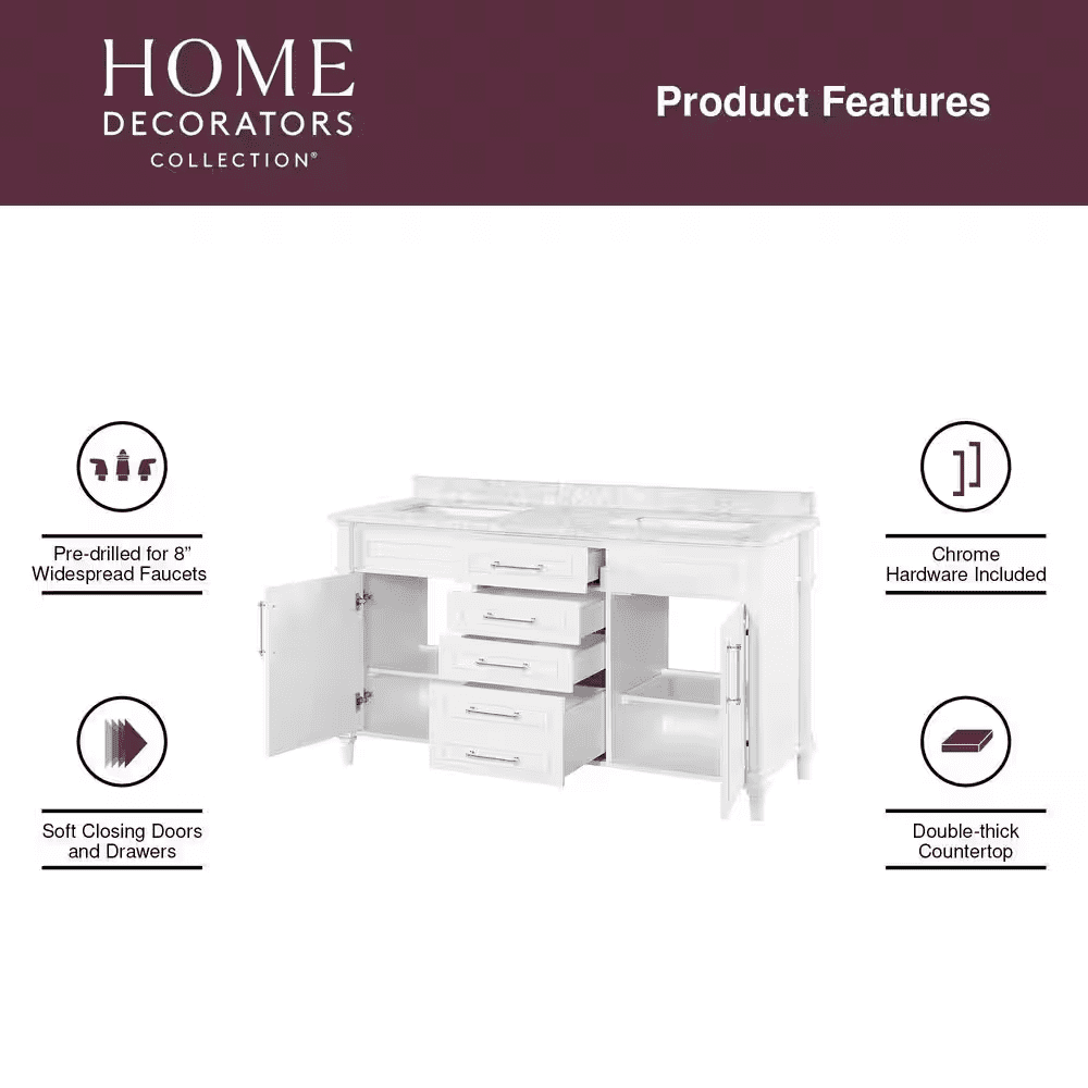 Stately elegance informs every detail of the Aberdeen 60 in. wide double vanity by Home Decorators Collection. From its luxe Carrara marble slab countertop with double bullnose edging and matching 3.15 in. high backsplash, to its carefully constructed white lacquered cabinetry with handsome trim, column legs and designer chrome hardware, the Aberdeen will impress. 2-undermount rectangular white ceramic sink basins are easily maintained, while the 2-spacious single door cabinets plus 4-drawers offer valuable bathroom storage.