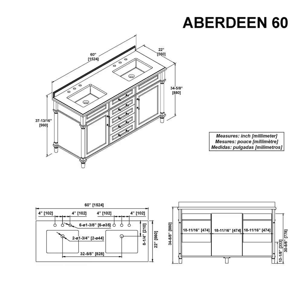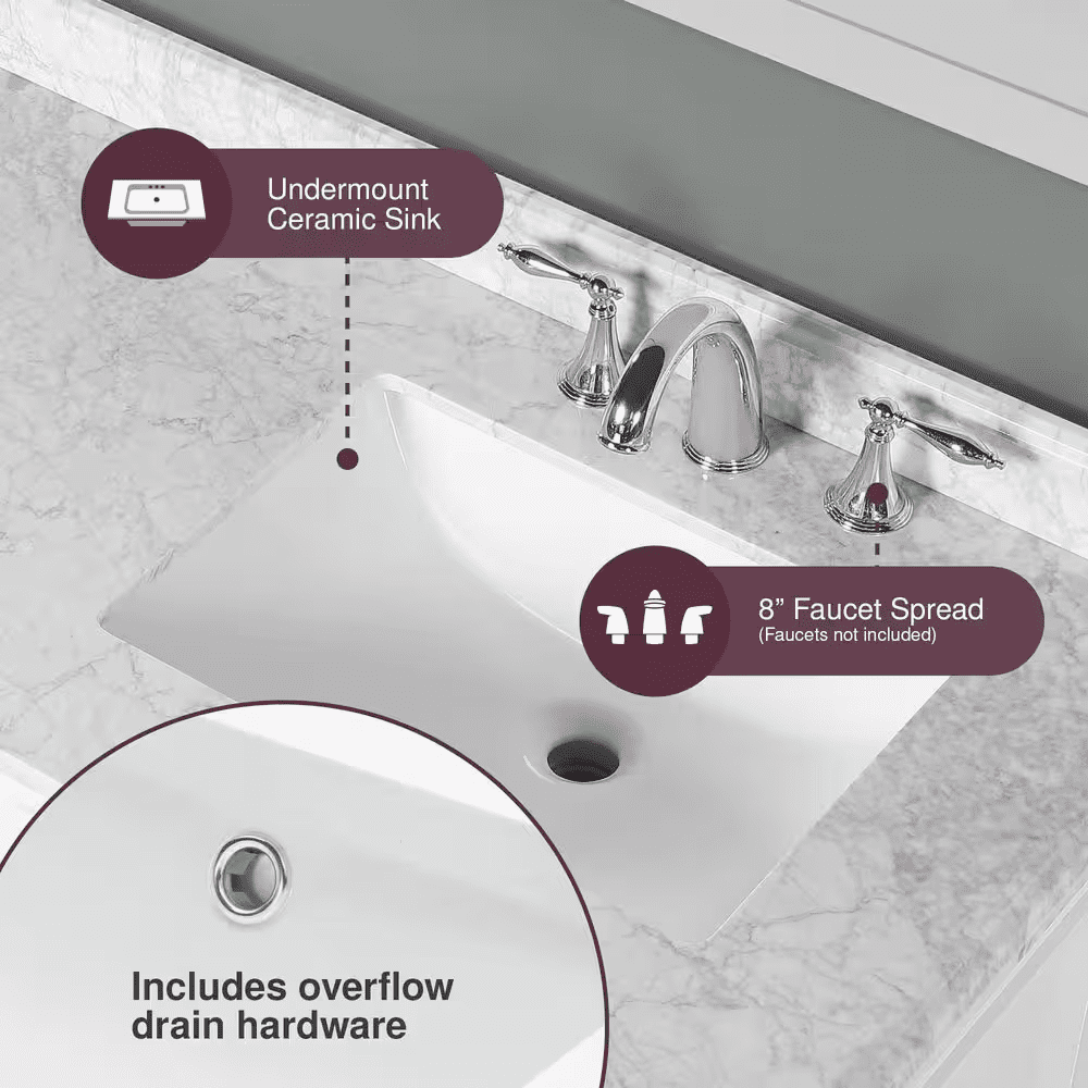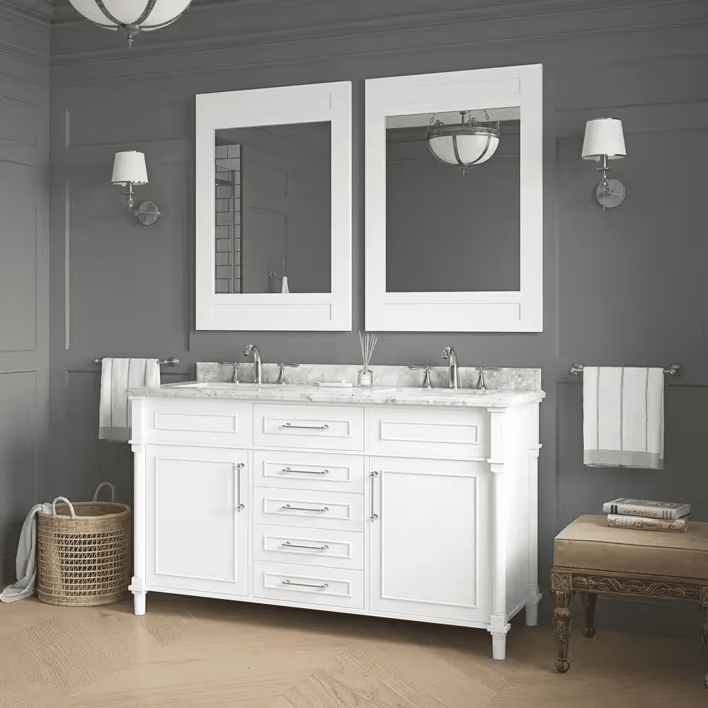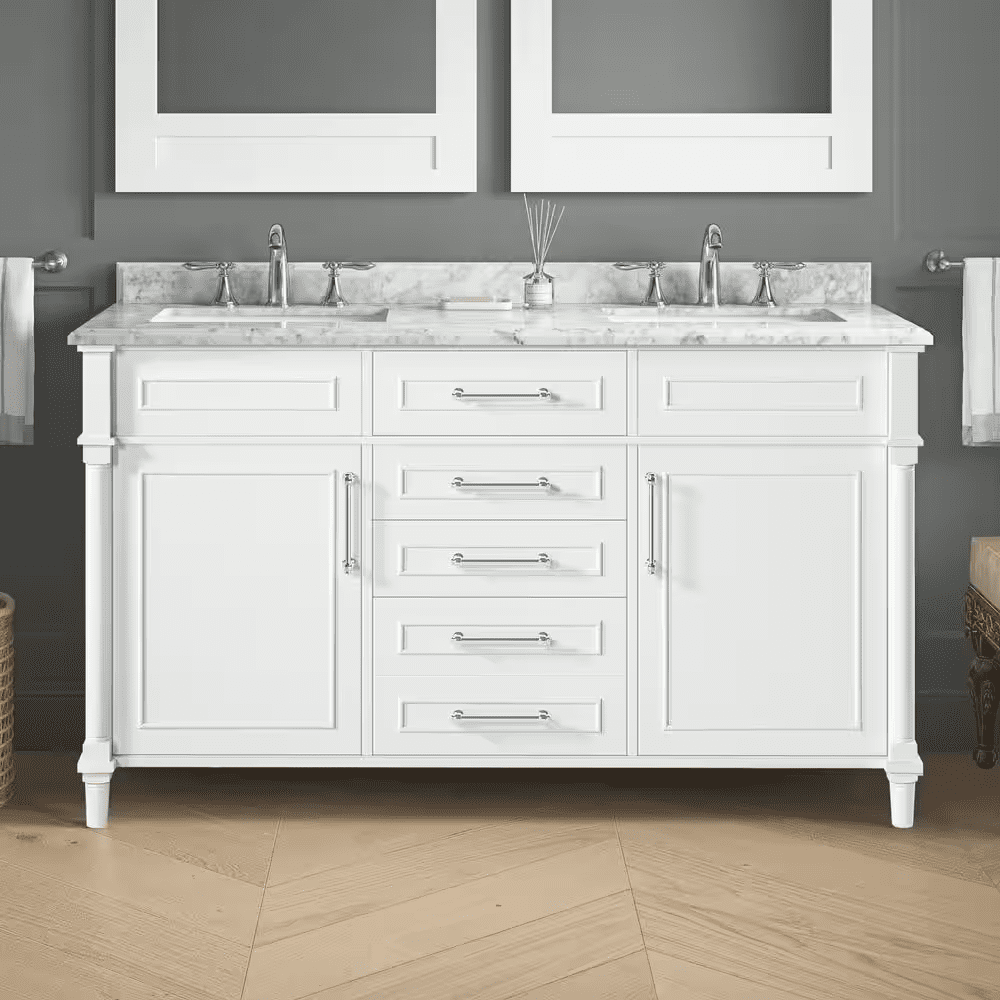 Stately elegance informs every detail of the Aberdeen 60 in. wide double vanity by Home Decorators Collection. From its luxe Carrara marble slab countertop with double bullnose edging and matching 3.15 in. high backsplash, to its carefully constructed white lacquered cabinetry with handsome trim, column legs and designer chrome hardware, the Aberdeen will impress. 2-undermount rectangular white ceramic sink basins are easily maintained, while the 2-spacious single door cabinets plus 4-drawers offer valuable bathroom storage.