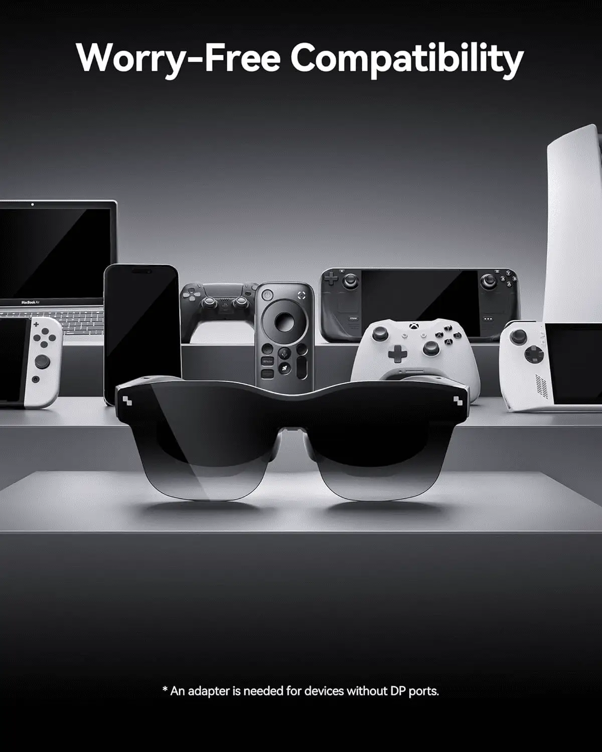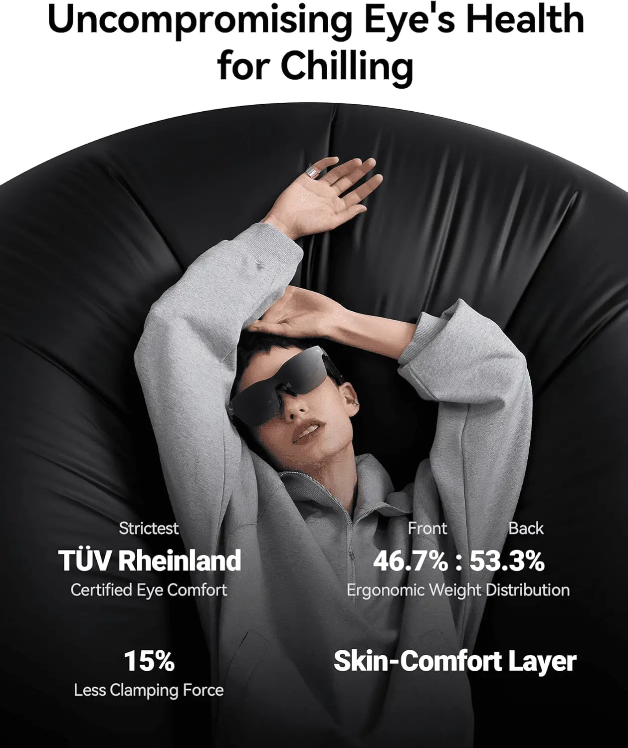 - [Portable & Comfortable]: The ultimate 9-point FlexiFit of temples and nose pad provides multiple adjustments to snug your face stably and comfortably. The skin-comfort layer grants a softer, refined fit. All in all, these lightweight AR glasses are ergonomically ideal for lying while watching movies or gaming.