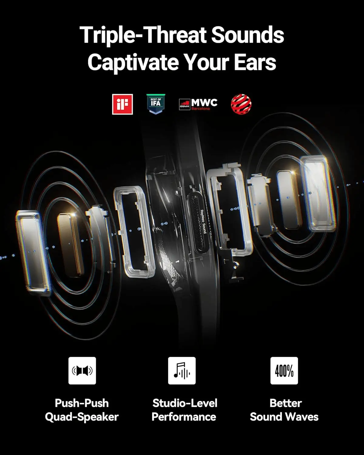 - [Studio-Level Acoustic]: World’s first AR Glasses with Push-Push Quad-Speaker design like the pros do, bringing unparalleled 400% better dynamic stereo sound with crystal-clear highs, detailed mids, and stronger bass, and making the more-than-VR experience more engaging.