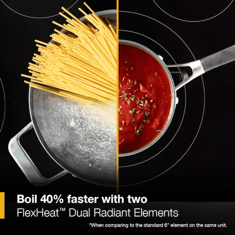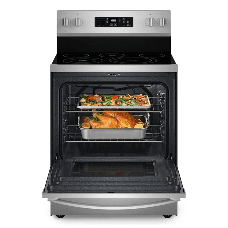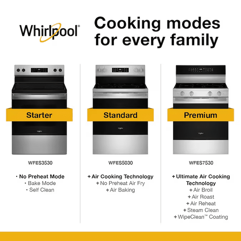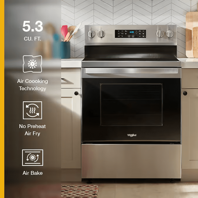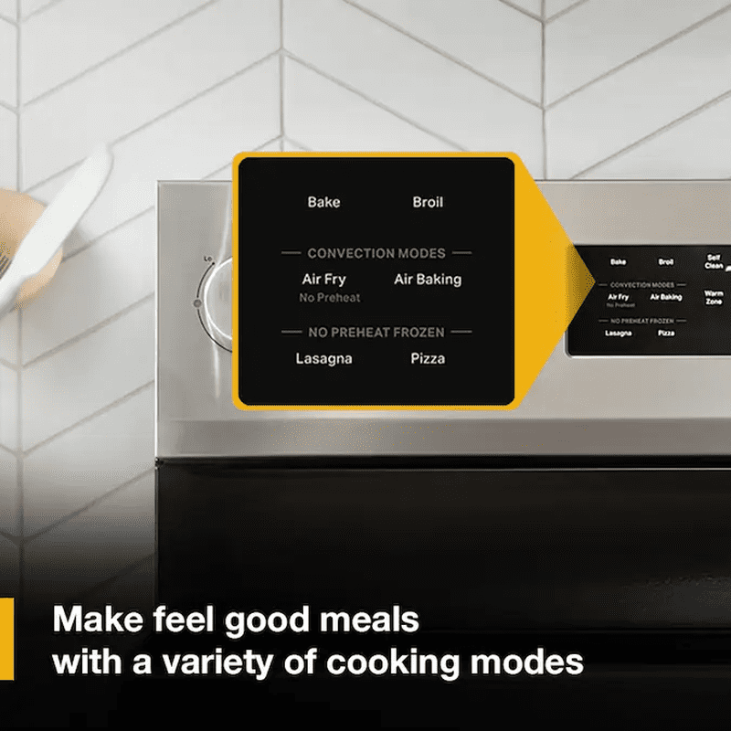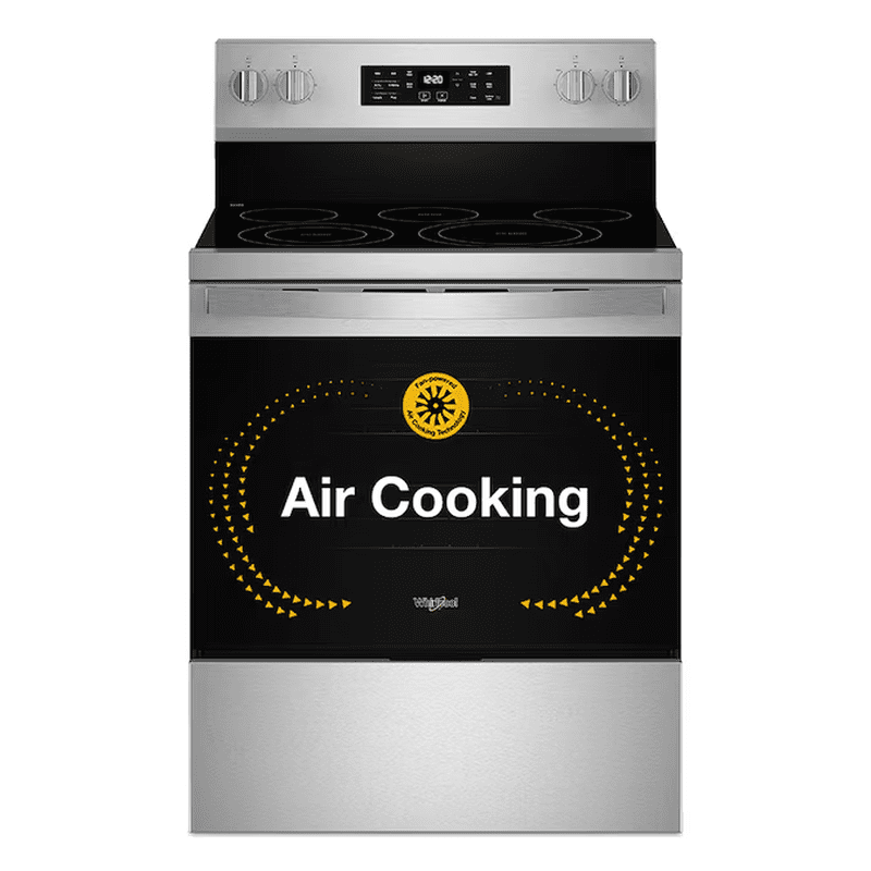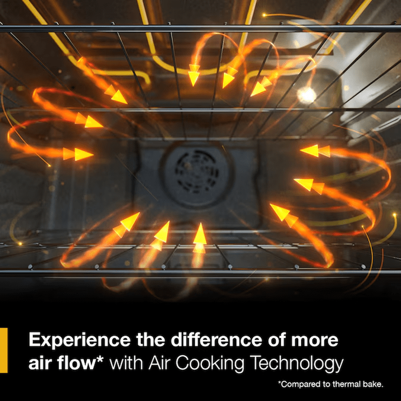 Experience the difference of Air Cooking Technology with this 30-inch electric range. Get crispy fast with No Preheat Air Fry, and bake evenly on multiple racks with the dynamic air flow of Air Baking. Make feel-good meals with a variety of cooking modes, and boil 40% faster with 2 FlexHeat Dual Radiant Elements. Compared to thermal bake When comparing the 9″ element to the standard 6″ element on the same unit.