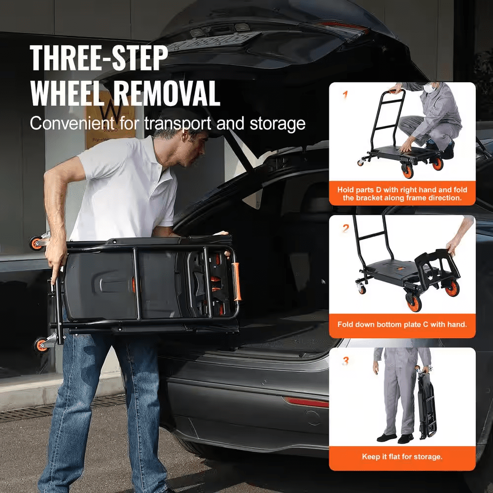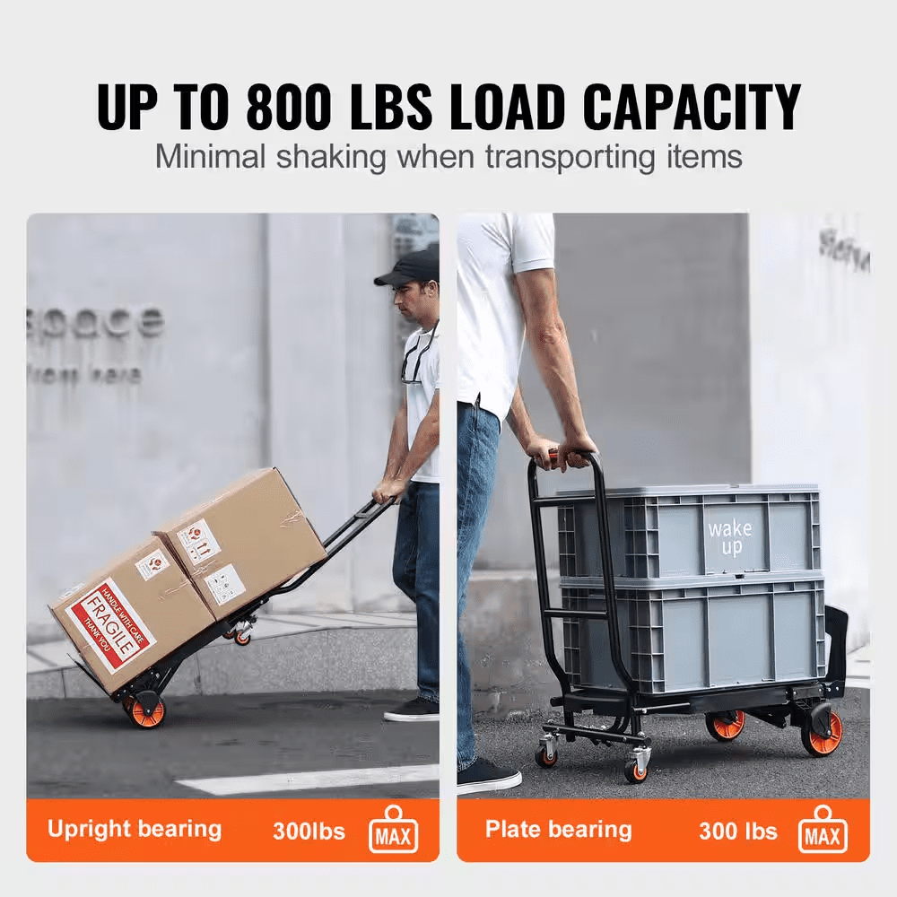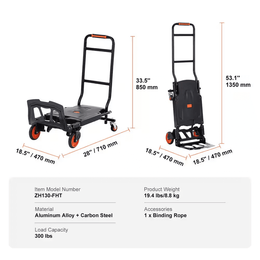 300 lbs. 2-in-1 Versatile Hand Truck. Powerful and Practical. This folding hand truck is constructed with strengthened aluminum and carbon steel. It is corrosion-resistant and rust-proof. As mentioned, it can change from a 2-wheel hand truck to a 4-wheel platform truck rapidly. The solid rubber wheels can be removed effortlessly, allowing for convenient storage without taking up much space. High Load Capacity. Smooth Rolling and Easy Braking. Extremely Durable. 2-in-1 Versatility. Quick Folding and Storage.
