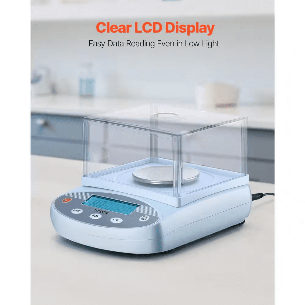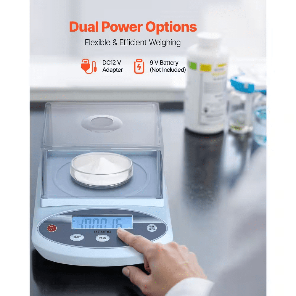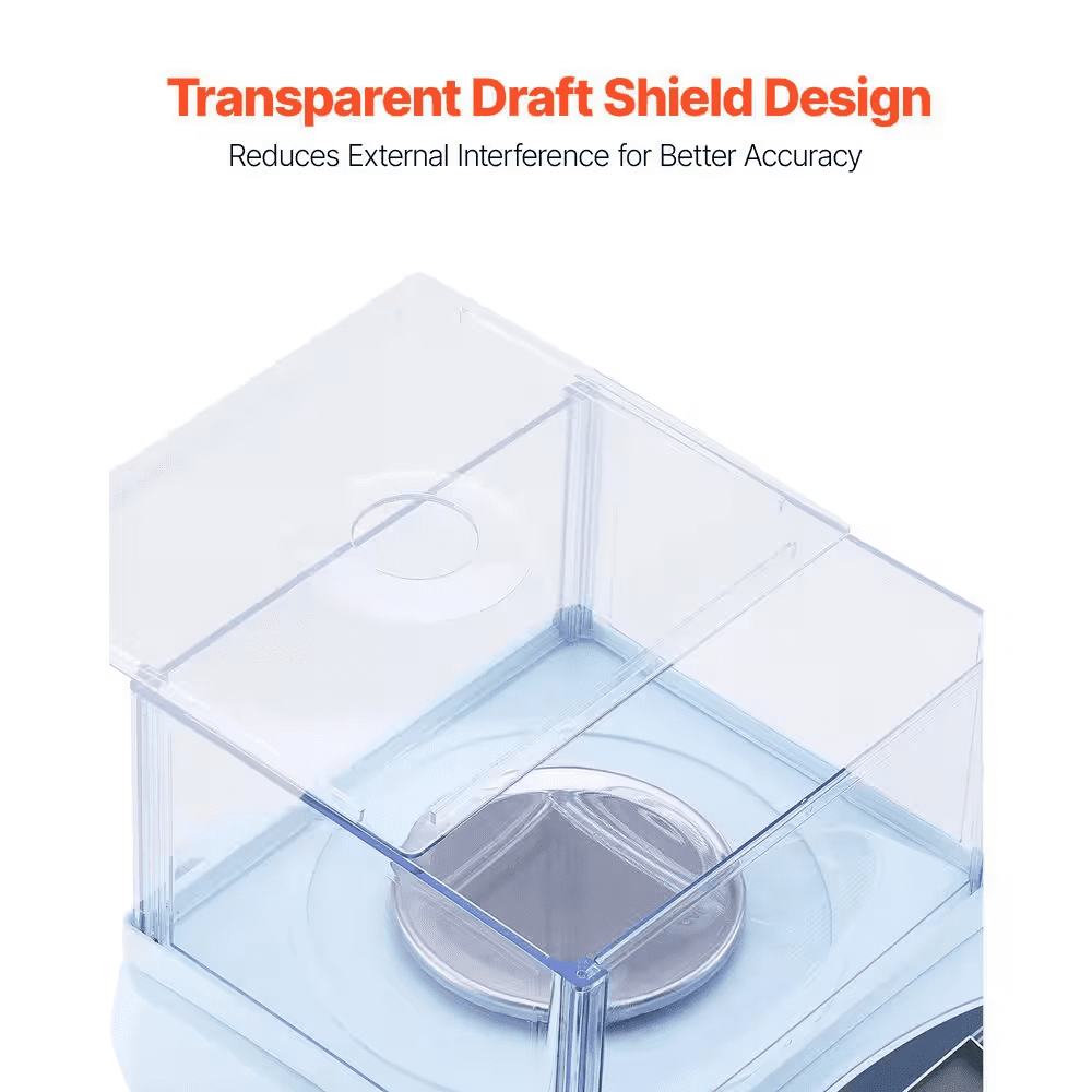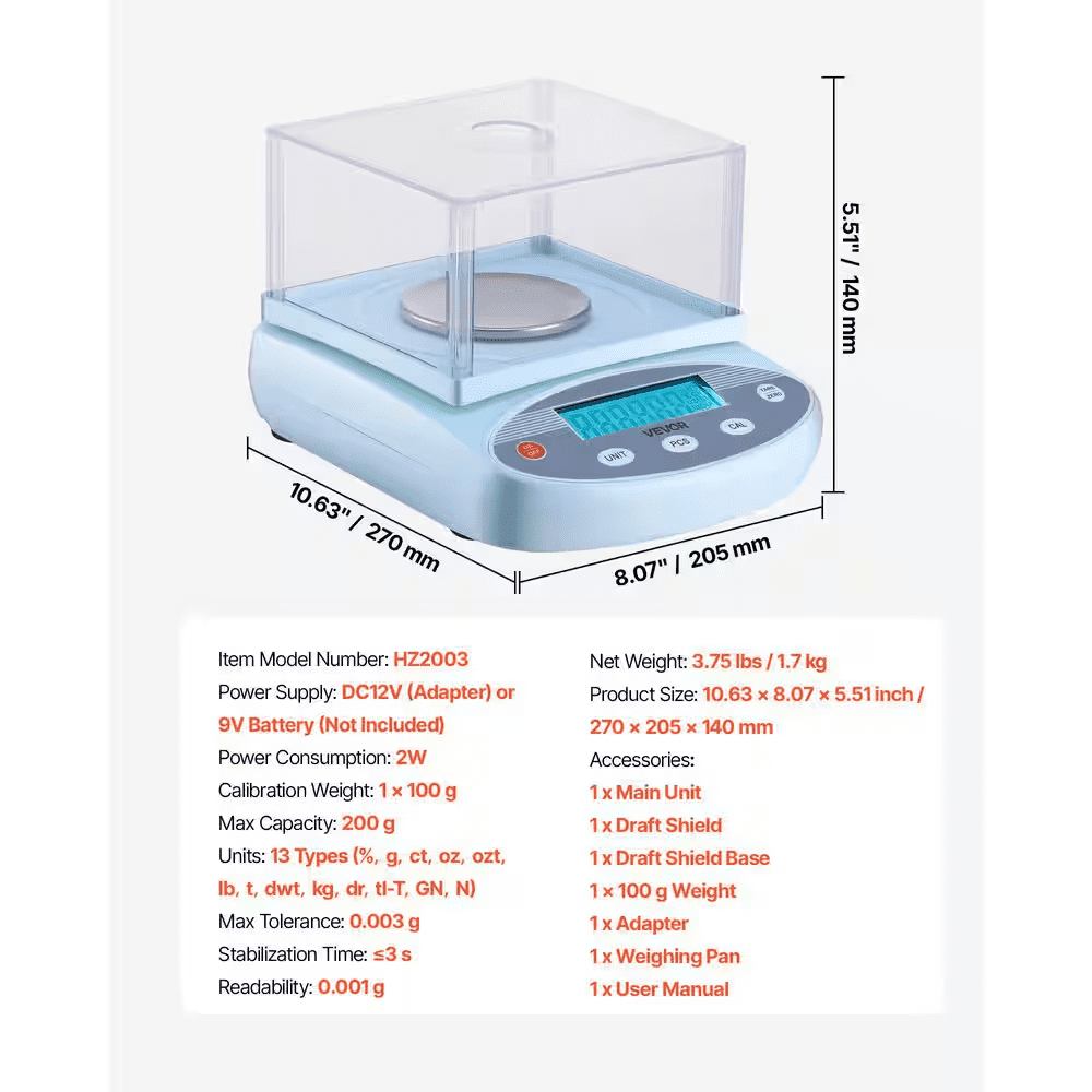 High Precision Analytical Balance with Draft Shield. This lab scale features 0.001 g accuracy, 200 g capacity, and 3 s stabilization time. Easily switch between 13 units for various laboratory needs with a clear LCD screen. It includes a 100 g weight, a draft shield, and a 3.5 in. stainless steel pan. It supports a DC 12-Volt adapter or 9-Volt batteries power.