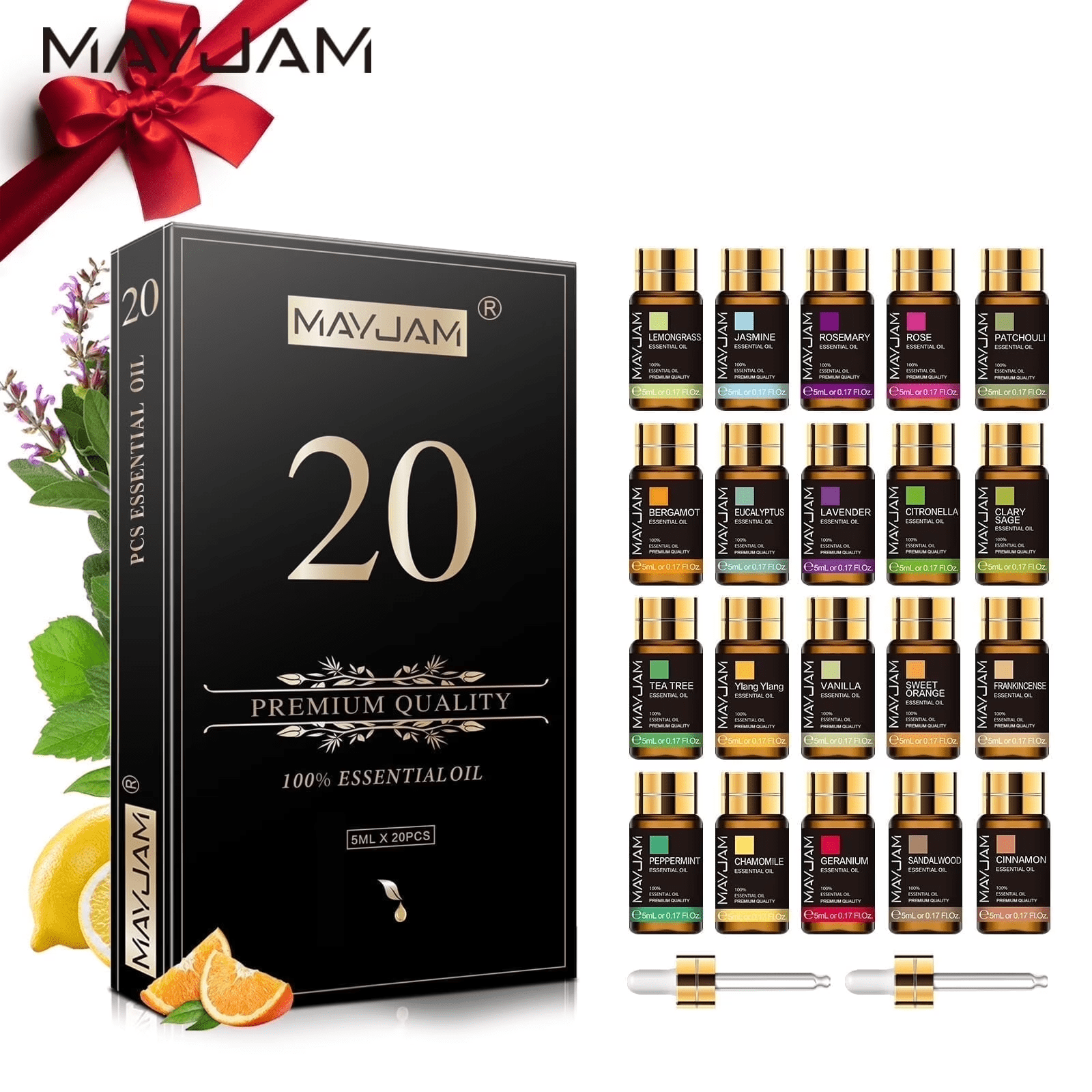 MAYJAM 20 x 5ML essential oils per set, you can use one kind of fragrance of essential oil one time or you can DIY the essential oils you want. Perfect Therapeutic Grade Essential Oils set for diffusers, humidifiers, oil burners, Spa and air purifiers. Use this essential oils set, you can enjoy different essential oil fragrances every day.