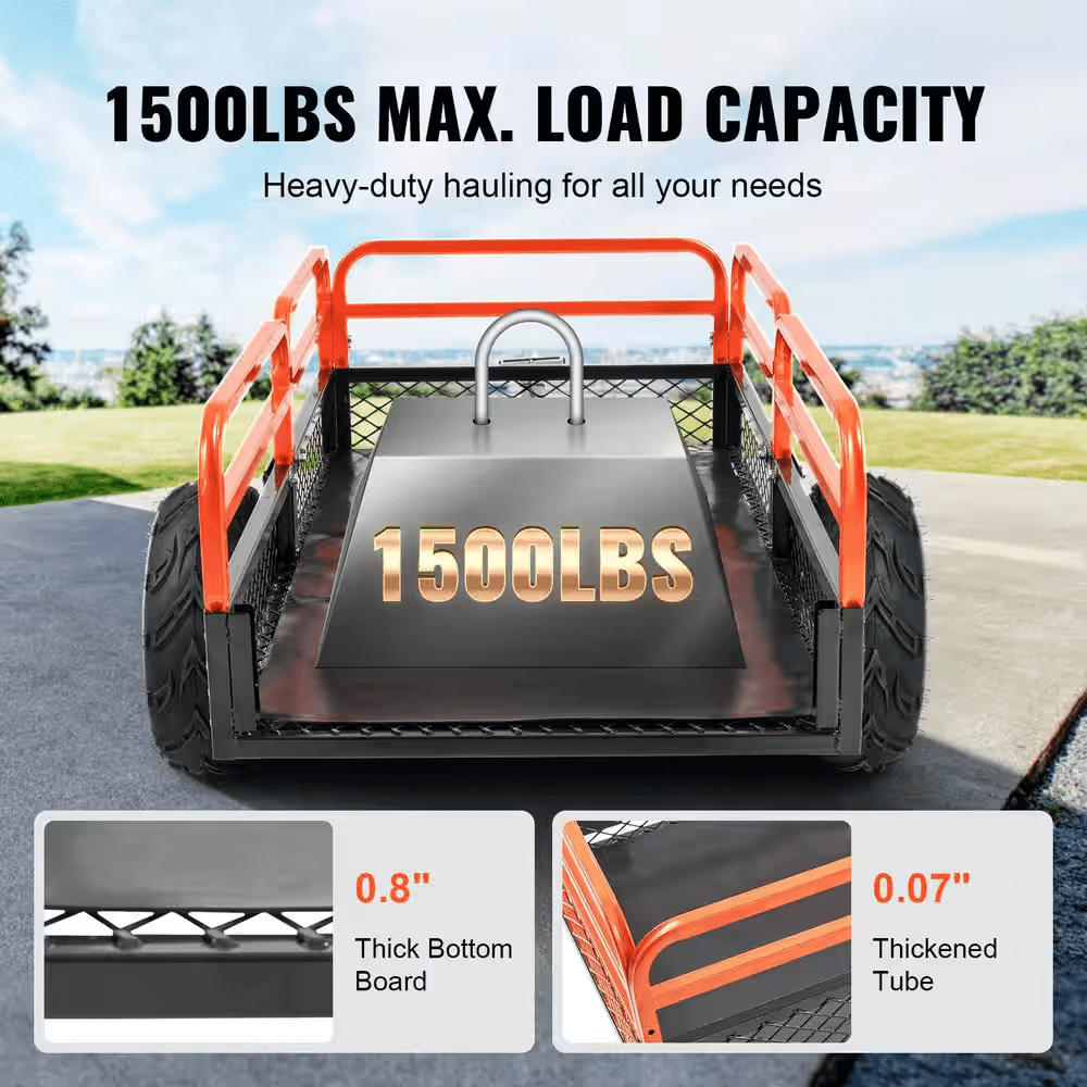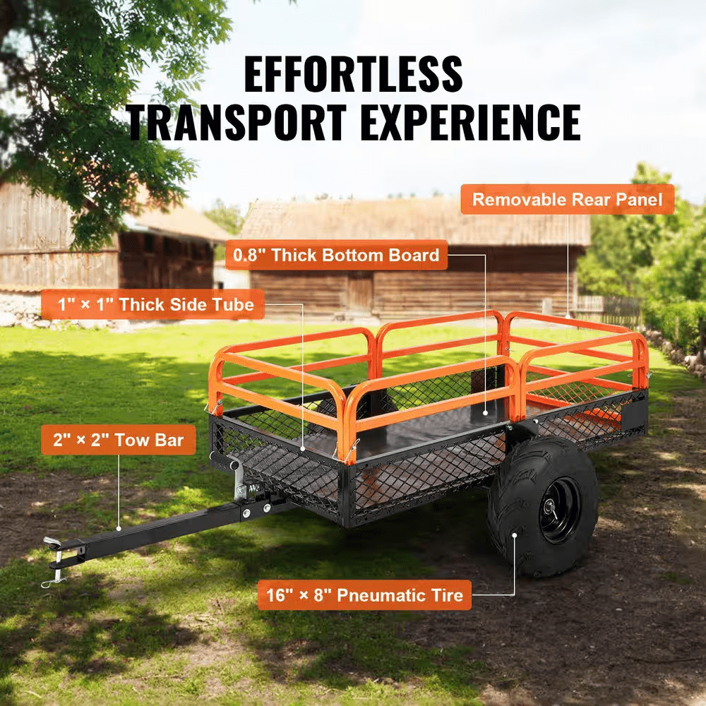 SVOPES Spacious Tow-Behind Dump Cart. Effortless Hauling with Ample Capacity for 1-Trip Jobs. Designed for heavy-duty use, our tow-behind dump cart is built to tackle the toughest garden tasks with its sturdy construction. It features a versatile hitch that easily attaches to lawnmowers, tractors, and more, making hauling effortless no matter the terrain. Simplify your outdoor work and handle large loads with ease. Versatile Hitch for Easy Attachment, Reliable Hauling Partner, Generous Load Capacity, Convenient Dumping Mechanism.