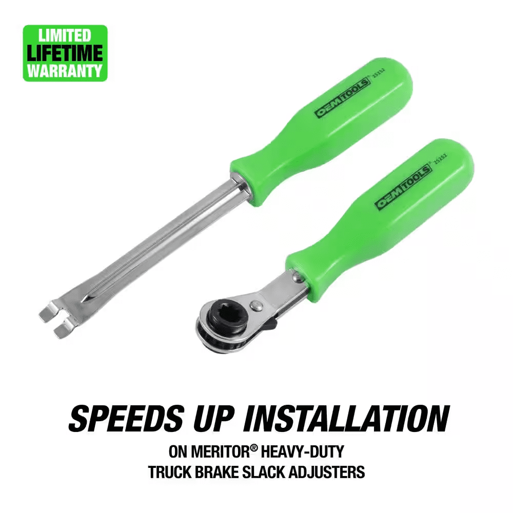 Ideal for adjusting automatic slack adjusters. the fork end tool retains the tensioner release button securely without prying or damaging It. The ratcheting wrench Includes a convenient side mounted forward and backward lever for easy operation and an angled head to allow extra clearance. The double square offset reversible wrench features an E-Z Grip handle for comfort.