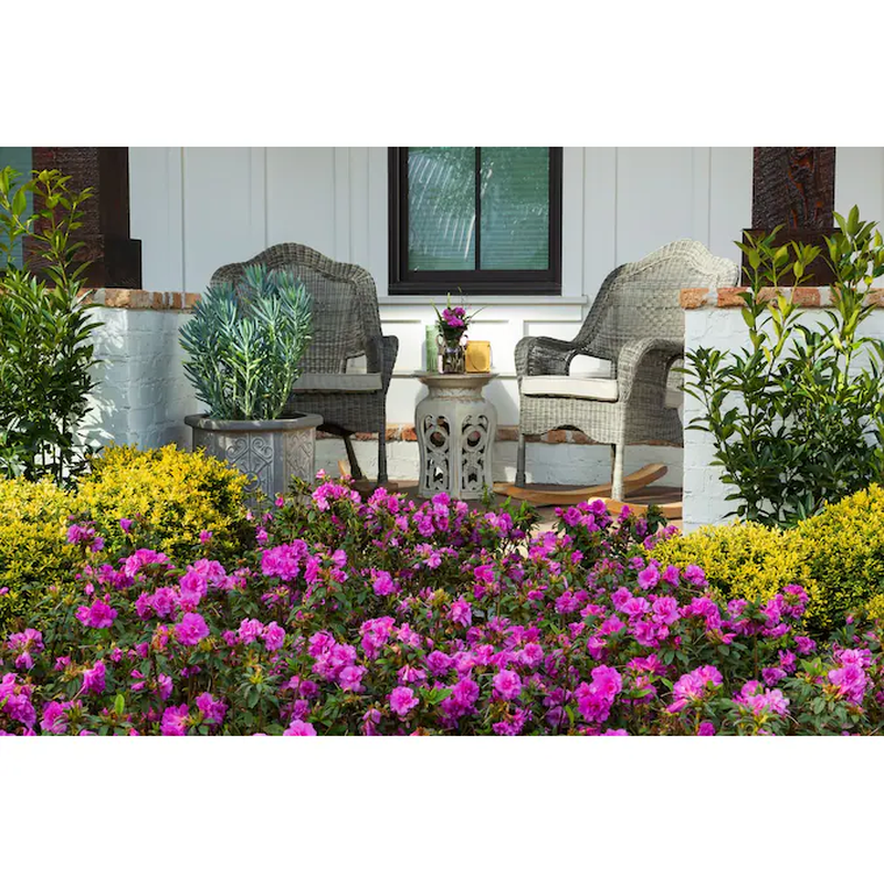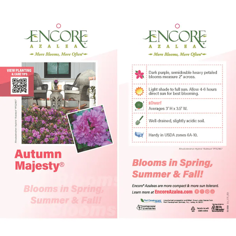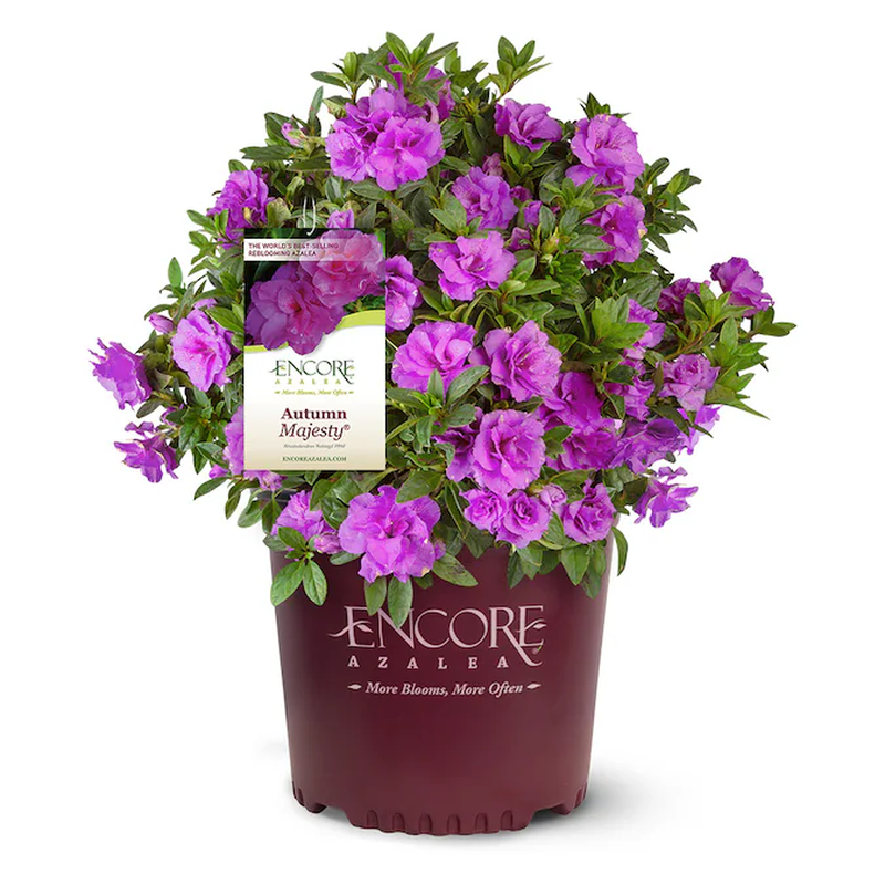 The Encore Azalea Autumn Majesty is a re-blooming intermediate-sized shrub that can bloom up to 3 times per year; Spring, Summer, and Fall. This shrub matures to 3 ft H X 3 ft W and produces 2.25 In. semi-double blooms that are purple. Use the Autumn Majesty Azaleas in planting hedges, borders, foundations, in container gardens, or in mass plantings in the landscape. Encore Azalea bushes will grow best is slightly acidic soils(pH 5.5-6.5) and when planted in a location that will receive 4-6 hours of sunlight per day. When planting dig the hole 2X the width of the size pot of the plant you are planting with a depth that will allow the root ball to be 1/4 to 1/2 In. above the soil level. Then use well-draining garden soil mixed with your native soil to backfill the hole around your new Azalea. Use a slow-release slightly acidic fertilizer each year in Spring to keep your Encore Azalea shrubs well fed to help maximize bloom production. ———- This item includes one 1 Gallon Encore Azalea Autumn Majesty (live plants) in plastic pots with soil. The pots will be wrapped in a poly bag to retain moisture and hold any soil that shakes lose in shipping. The plant will be shipped in a cardboard box that has been designed to hold the plant in place to reduce any chance of damage in transit. As soon as the plant arrives it should be unpackaged, un-bagged, and watered. ——–These plants ship from the Gulf Coast of Alabama. We recommend that customers outside of the southeastern United States order during the milder times of year (Spring/Fall) to prevent heat/cold stress during transit.