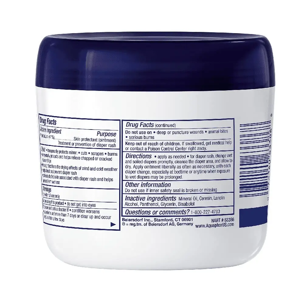 Aquaphor Baby Healing Ointment is suitable for baby’s sensitive skin. Ideal for use as a baby ointment for diaper rash relief, this Aquaphor Healing Ointment is also great for soothing dry, chapped or cracked skin and also helps to prevent chafing. Uniquely formulated with 41% Petrolatum (skin protectant) to allow oxygen to flow, Aquaphor Baby Healing Ointment nourishes and protects baby’s skin to enhance healing from skin irritations such as chapped skin from teething and drool rash. Parents can also use the ointment to soften dry hands and cuticles, cracked heels or chapped lips. Aquaphor Baby Healing Ointment is preservative and fragrance free, to suit the sensitive skin of babies. Aquaphor is a pediatrician recommended brand and is a multipurpose solution for your baby’s many skincare needs. Each of the ingredients in Aquaphor skin care products are tested and approved for their quality and safety.
