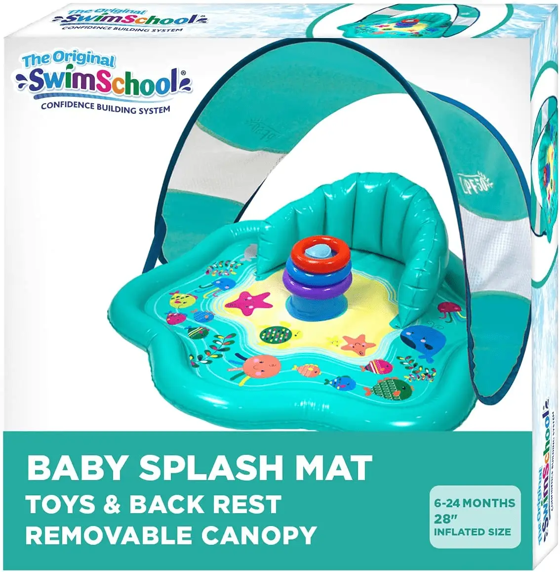 - Baby splash pad: Removable/adjustable canopy features a multi-position plastic hinge, which allows for 120-degree range and UPF 50 sun protection; take it to the beach, or back yard for a day of fun; not for use in the water
