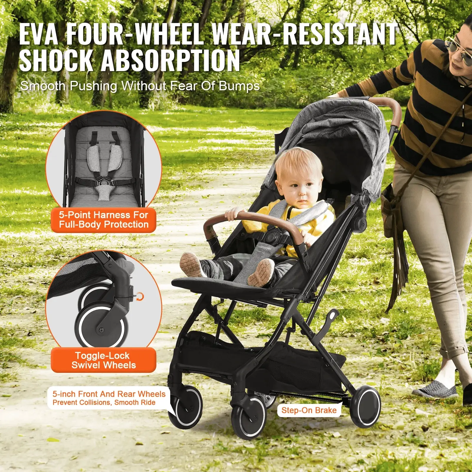 - Smooth and Safe Strolling: Equipped with 5-inch EVA solid front and rear wheels, toggle lock swivel wheels, and a step-on brake, this stroller prevents slipping and provides a smooth pushing experience. It also features built-in spring suspension and a 5-point safety harness to handle bumpy roads with ease.