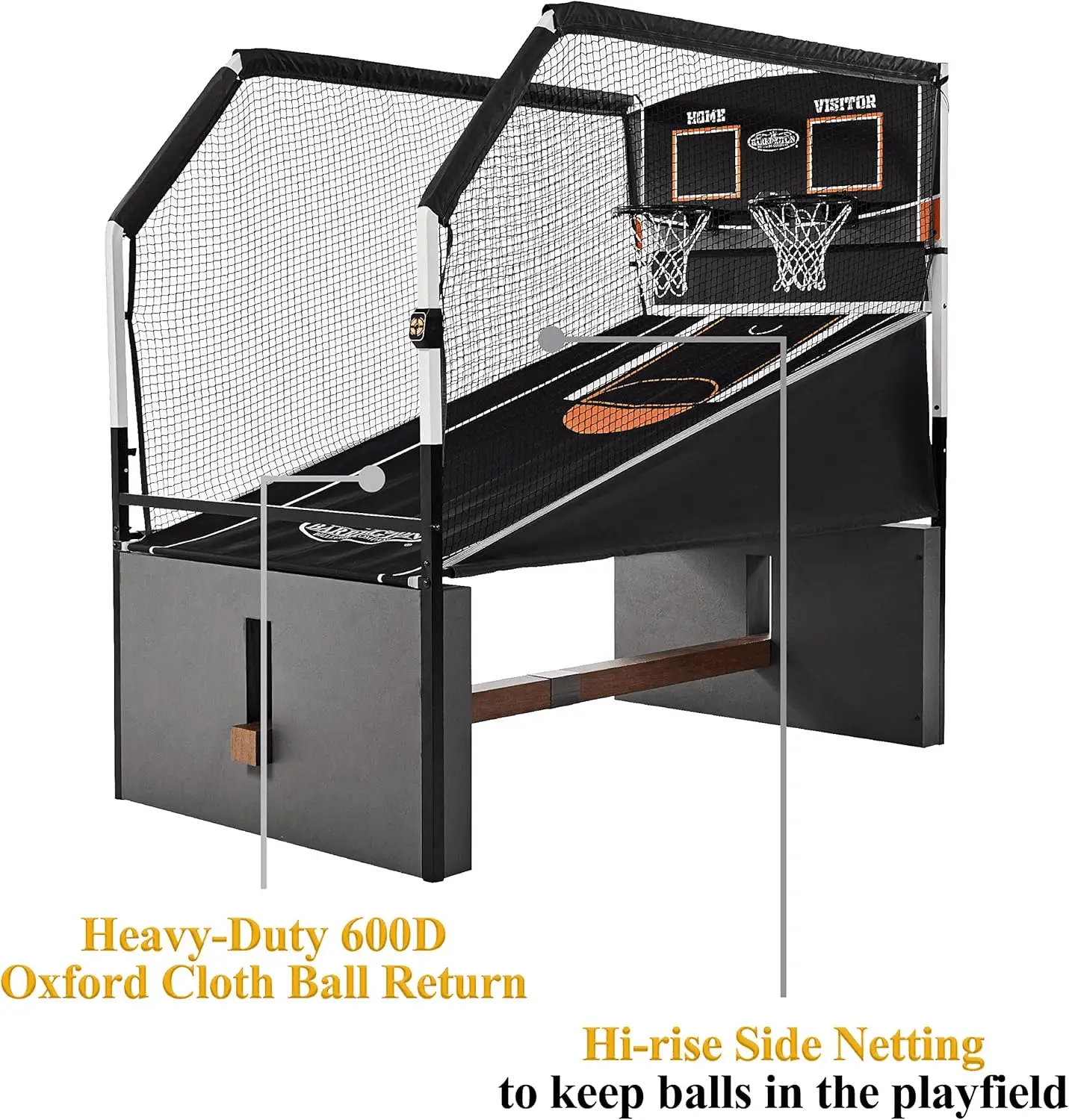 This 2-player arcade-style basketball game has the assembled dimensions of 84″L x 48″W x 90″H and is built for active play with high-rise side netting, heavy-duty 600D Oxford Cloth ball return, MDF backboard, and a pair of 13” steel rims with durable Tetoron nets.