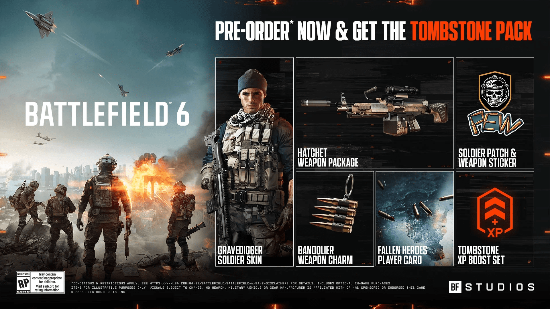 The ultimate all-out warfare experience. Fight in high-intensity infantry combat. Rip through the skies in aerial dogfights. Demolish your environment for a strategic advantage. Harness complete control over every action and movement using the Kinesthetic Combat System. In a war of tanks, fighter jets, and massive combat arsenals—the deadliest weapon is your squad. This is Battlefield™ 6. PRE-ORDER BONUS This is your war – take control before you hit the front lines. Pre-order Battlefield 6 and get the Tombstone Pack. This is your war – take control before you hit the front lines. Pre-order Battlefield 6 and get the Tombstone Pack. Includes a Soldier Skin, Weapon package, Tombstone XP Boost Set, Player Card, Soldier Patch, and more. Pre-order Battlefield™ 6 and receive the Tombstone Pack, featuring: Gravedigger Soldier Skin “Fallen Heroes” Player Card “Bandolier” Weapon Charm “Express Delivery” Weapon Sticker “Hatchet” L110 Weapon Package “Doomsayer” Soldier Patch Tombstone XP Boost Set o 60 min Career XP Boost o 60 min Hardware XP Boost