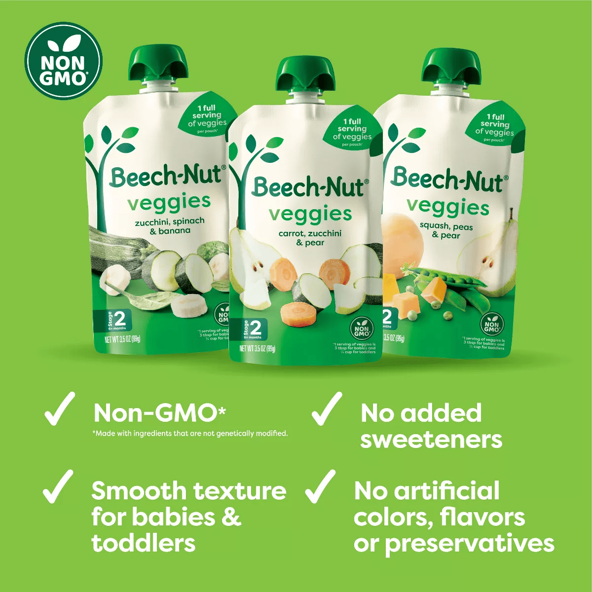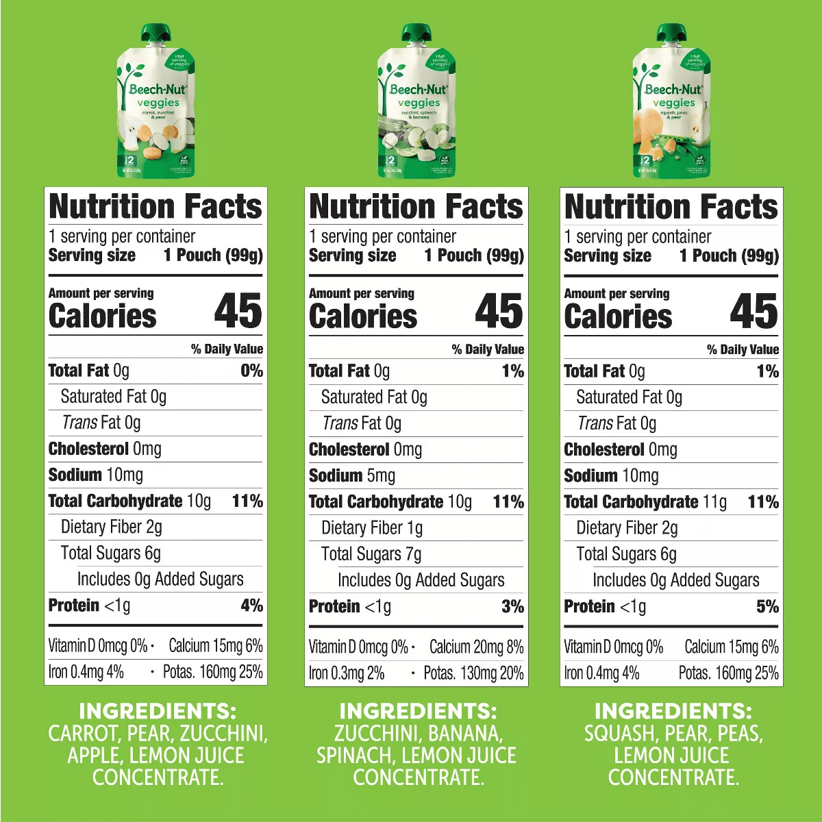 - Beech-Nut Variety Pack includes (3) carrot, zucchini & pear, (3) zucchini, spinach & banana and (3) squash, peas & pear pouches