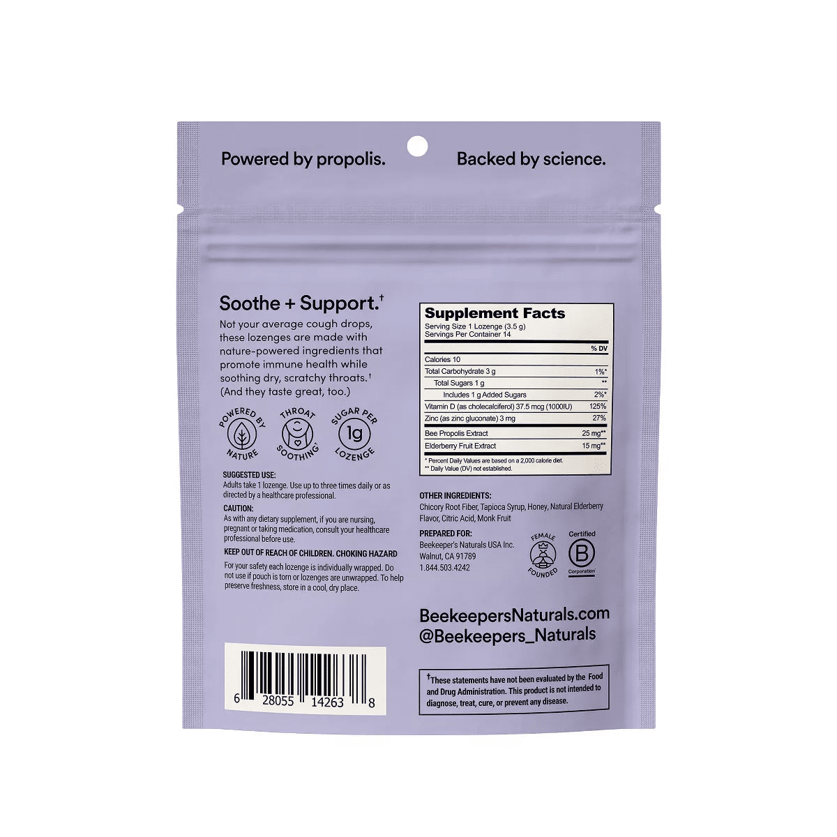 Soothe your throat and support your immune system with Beekeeper’s Naturals Soothing Elderberry Lozenges. Made with pure honey, elderberry extract, bee propolis, vitamin D, and zinc, these clean lozenges deliver natural relief and daily immune support without the junk. Each lozenge has just 1g of sugar and zero artificial flavors, colors, or fillers. Perfect for travel, work, or everyday wellness — they taste great, calm your throat, and help you feel your best the natural way.