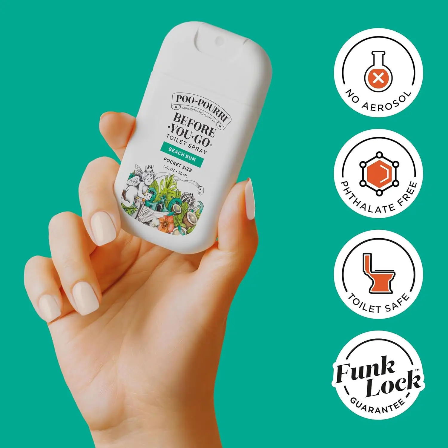 Poo~Pourri Before-You-Go Toilet Spray, Beach Bum Whether you’re hitting the road, heading to the office, or jet-setting off to paradise, the Poo~Pourri Beach Bum has your backside covered! This spray features a signature scent: Coconut, Orchid and Toasted Praline, in a 1 fl oz travel-sized bottle. Compact, but with big funk-fighting power, this plant-based spray use Funk Lock Technology to trap odors beneath the water’s surface, before they escape into the air. That means no awkward exits, and no lingering funk. The only thing you smell is a fresh burst of essential oils. Designed with travel in mind, each bottle is made of durable plastic, delivers up to 50 uses, and fits in bags, purses, or pockets. Equipped with a sleek new sprayer, the nozzle is easy to press, delivering a fine mist and an even spray pattern. Spritz before you go and leave any bathroom smelling like a day at the beach, sipping a fruity cocktail from a coconut. Suitable for commuters, travelers, partygoers, or anyone on the go, this toilet freshener makes a thoughtful gift. So go ahead—use it before you go, wherever you go. Because everyone deserves to leave the bathroom smelling better than they found it.