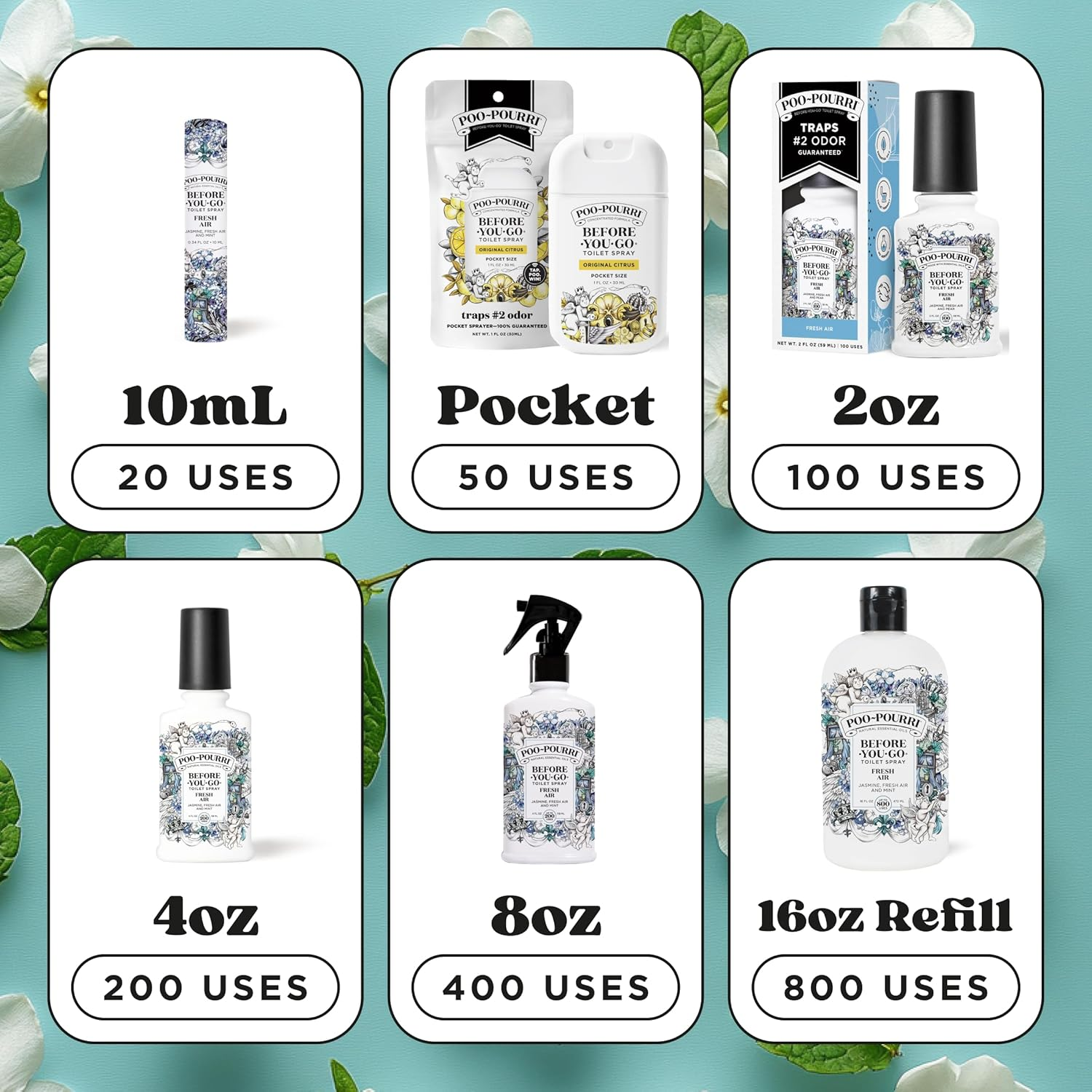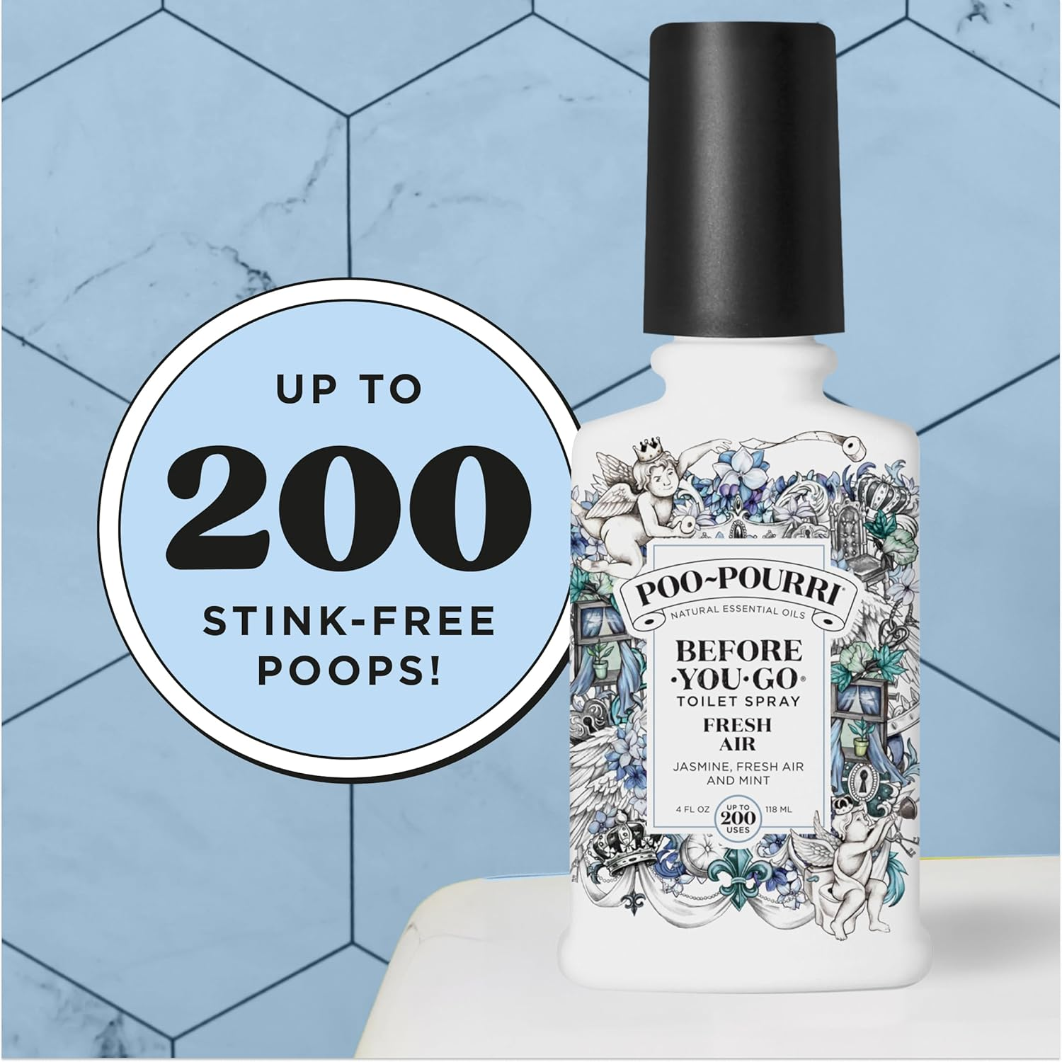 Poo~Pourri Before-You-Go Toilet Spray, Fresh Air No need to open bathroom window to smell fresh breeze. Fill the room with Poo~Pourri Fresh Air. This complex, yet clean scent is a blend of florals like jasmine and rose, cooling mints like peppermint and spearmint, and zesty citruses like lemon and bergamot orange. Poo~pourri freshens bathroom odor before it begins by creating a barrier on the surface of water—so you can leave the porcelain throne smelling better than you found it. Contains no harsh ingredients. No parabens, phthalates, aerosols or formaldehyde. Simply shake, spritz 3–5 times into the bowl before you go, and let the Funk-Lock Technology work to create a barrier on the water’s surface. It helps keep unpleasant smells contained and leaves the space lightly scented. Each reusable, refillable bottle delivers up to 200 uses, with an easy-press nozzle that creates a fine, even mist. Whether you’re at home, at the office, in a new living situation, traveling or using a public restroom, this spray adds confidence to your routine. Suitable for everyday use or as a thoughtful gift, Poo~Pourri also works in other odor zones—think diaper pails, trash bins, or laundry rooms. So go ahead—use it before you go, wherever you go!