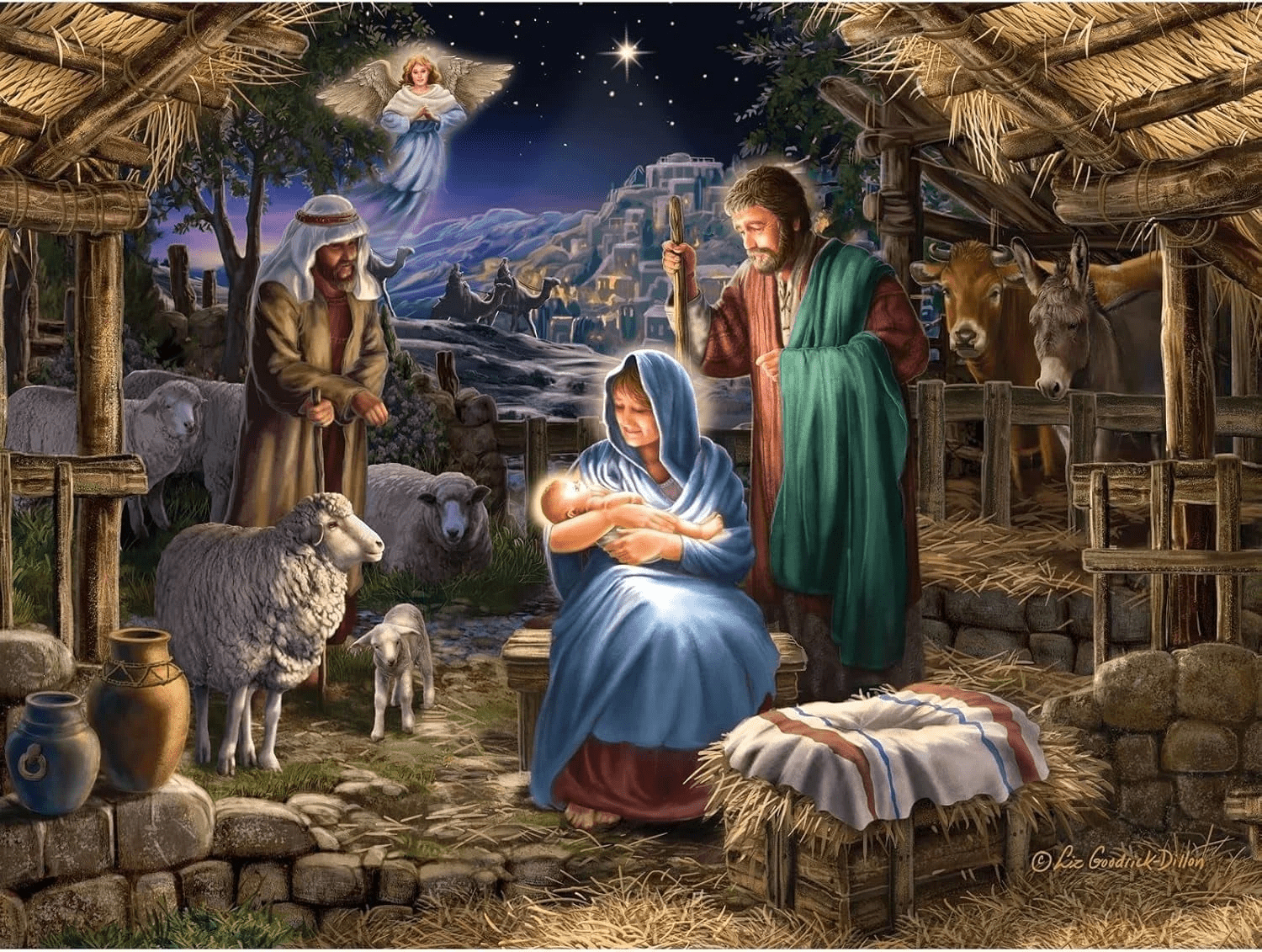 - Features a beautifully illustrated Nativity scene by artist Liz Goodrick‑Dillon, celebrating the true meaning of Christmas with the Holy Family.
