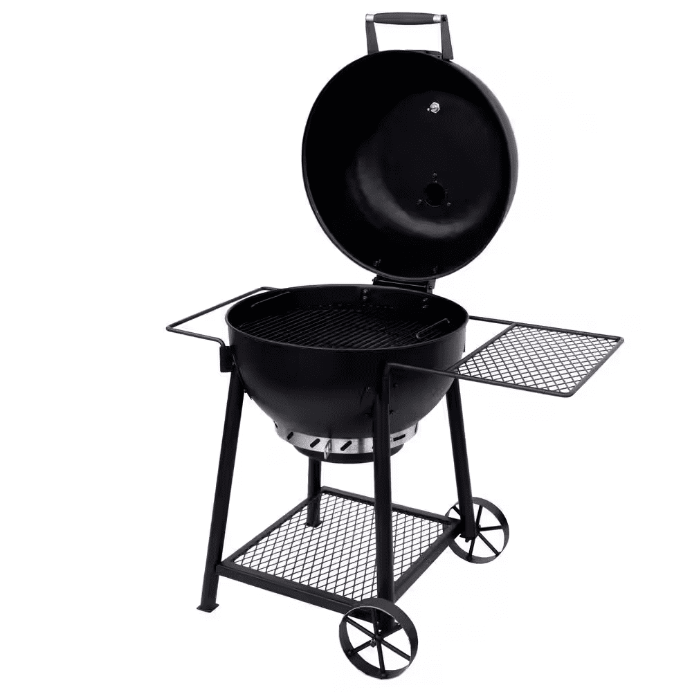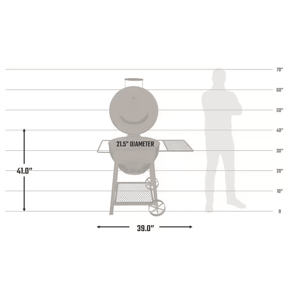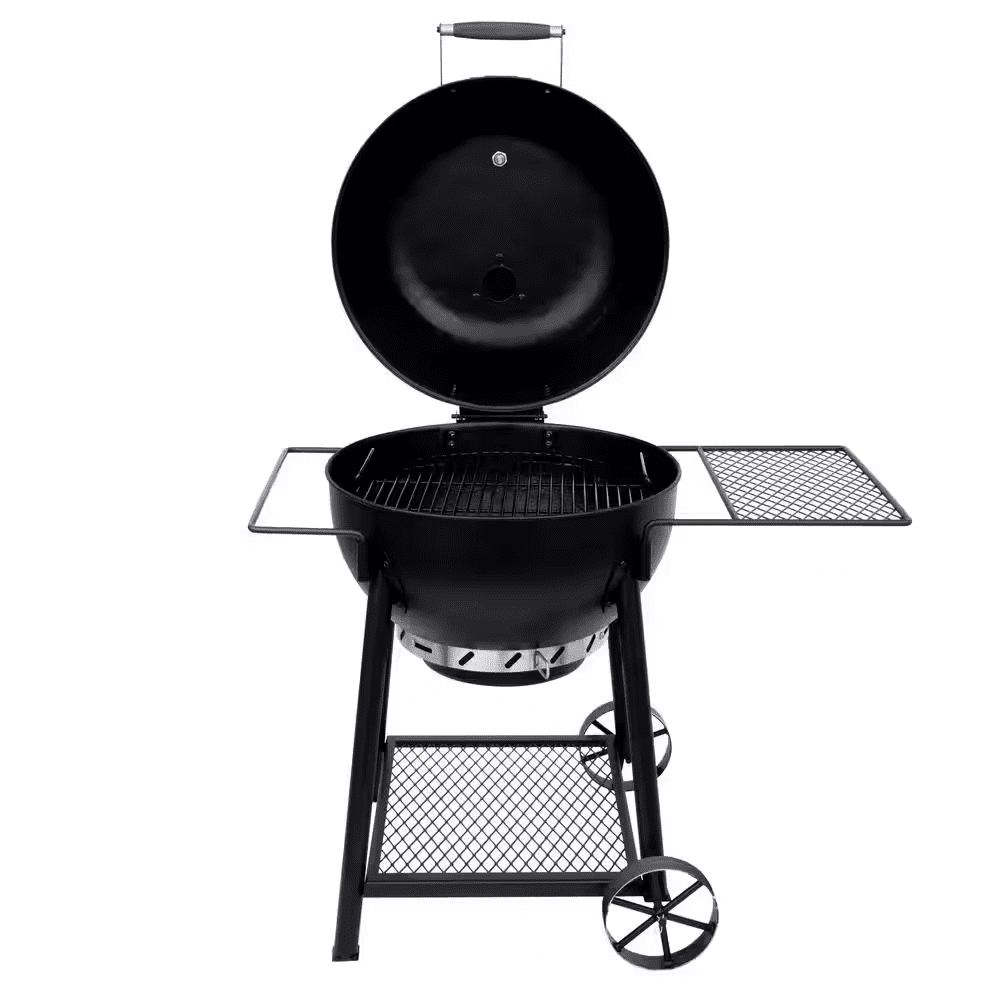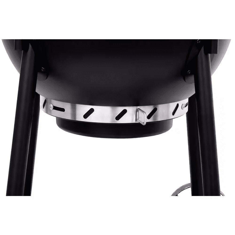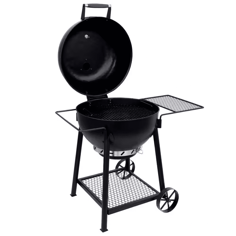 The Blackjack Kettle Charcoal Grill delivers charcoal grilling performance like no other with innovative features, rugged style and durability. The fire bowl and lid are porcelain-coated for superior durability and rust resistance. An adjustable smokestack and 360° air intake deliver reliable temperature control and even fuel burn. Cleanup is simpler than ever with a porcelain-coated cooking grate and removable ash pan and the hinged lid lets you easily check on your food and fuel. A large side shelf provides ample space for food prep and serving, while the towel bar keeps grilling tools and towels handy. Both the shelf and the towel bar can be swapped out for a second shelf or towel bar (sold separately).