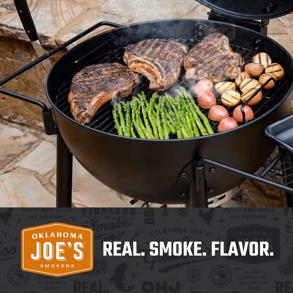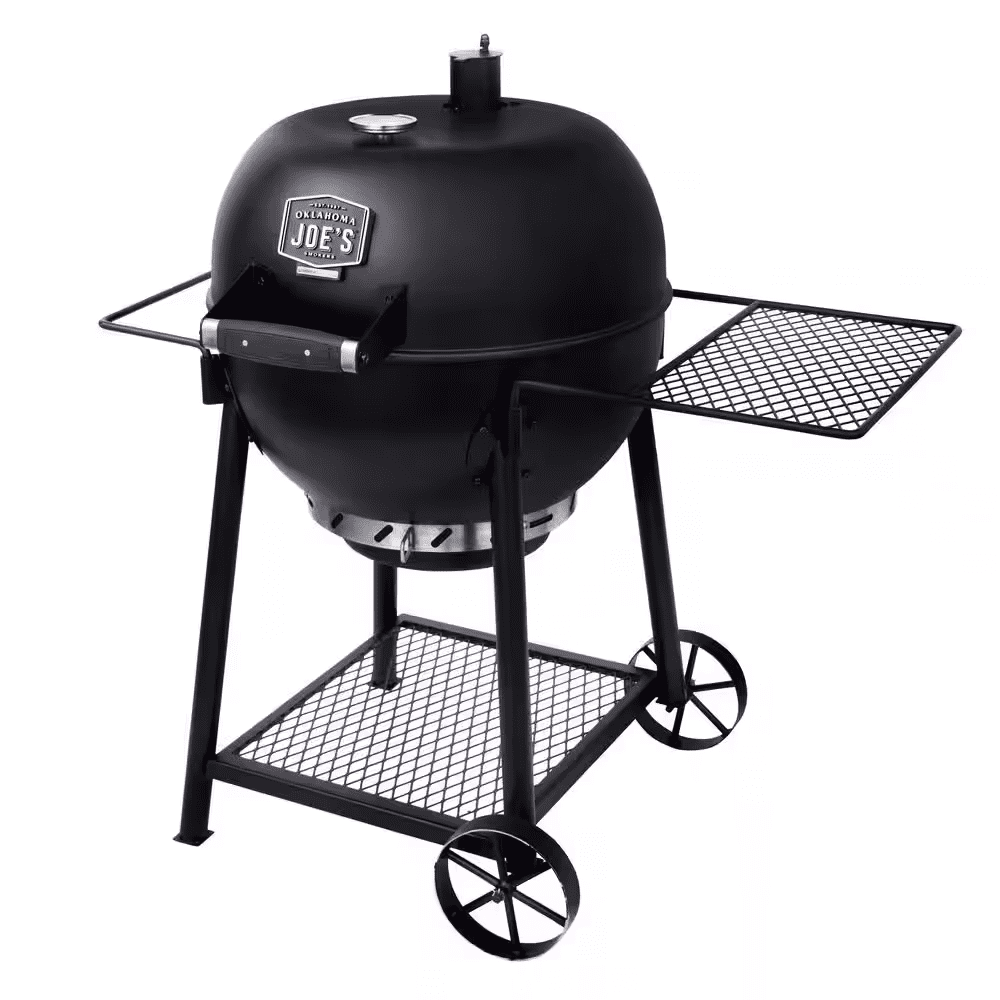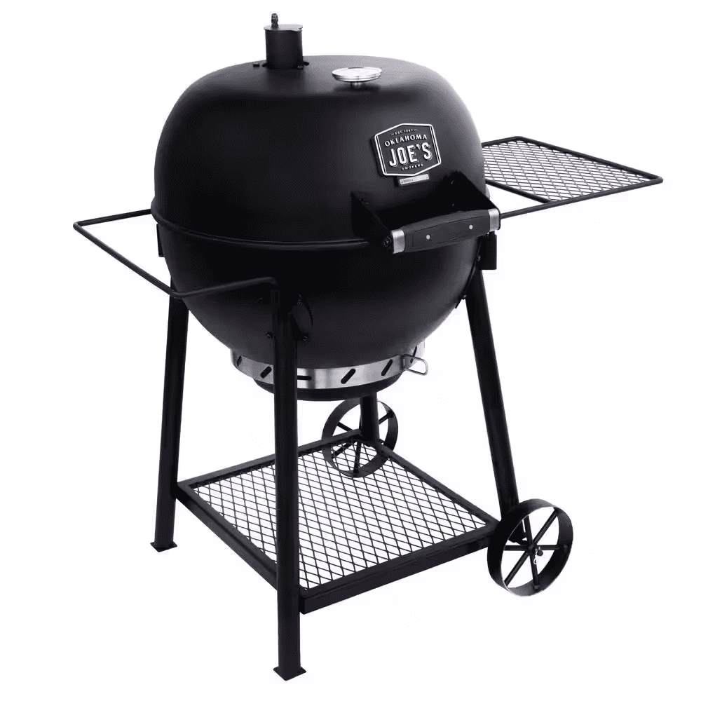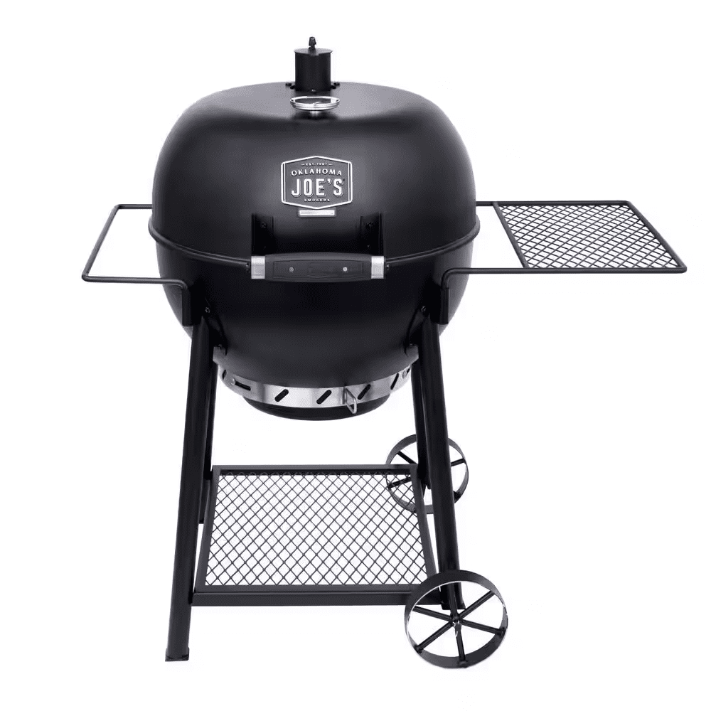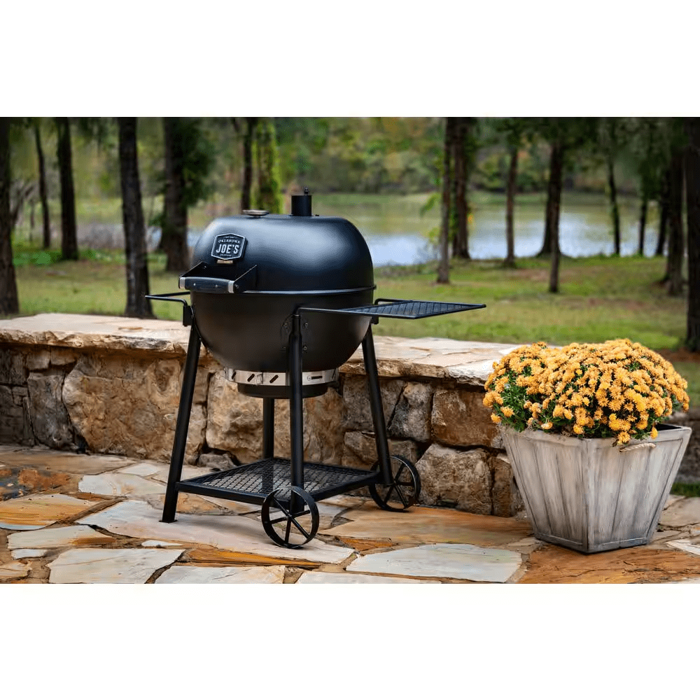 The Blackjack Kettle Charcoal Grill delivers charcoal grilling performance like no other with innovative features, rugged style and durability. The fire bowl and lid are porcelain-coated for superior durability and rust resistance. An adjustable smokestack and 360° air intake deliver reliable temperature control and even fuel burn. Cleanup is simpler than ever with a porcelain-coated cooking grate and removable ash pan and the hinged lid lets you easily check on your food and fuel. A large side shelf provides ample space for food prep and serving, while the towel bar keeps grilling tools and towels handy. Both the shelf and the towel bar can be swapped out for a second shelf or towel bar (sold separately).