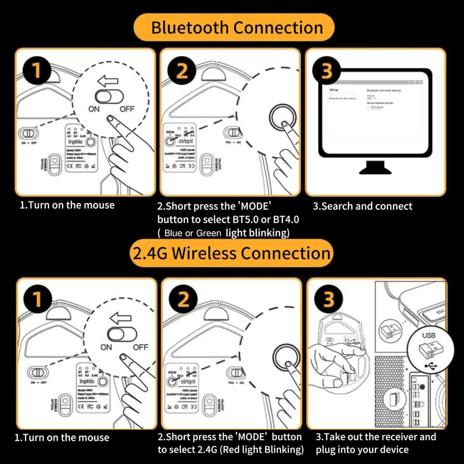 - Tri-mode Wireless Connectivity: Experience seamless connectivity with our Tri-mode wireless mouse, supporting 2.4G and Bluetooth (BT4.0 and BT 5.0 )connections. Switch effortlessly between your desktop, laptop, and tablet, enjoying a flexible and convenient usage experience