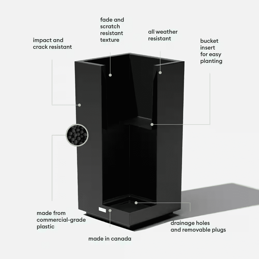 Standing tall and proud to feature its clean, sleek lines, the Veradek Pedestal Planter adds character to outdoor spaces like the front porch, patio or backyard. Easily switch out tall plants, flowers or shrubs and prevent overwatering with the removable insert bucket and pre-drilled drainage holes. This sturdy yet lightweight planter is proudly crafted in Canada from high-grade recycled plastic, making it resistant to cracks, fading and UV and allowing it to withstand extreme temperatures ranging from -20 to +120 degrees. With the ideal balance of design, structure and purpose, the Pedestal pairs perfectly with any arrangement to make a grand statement.