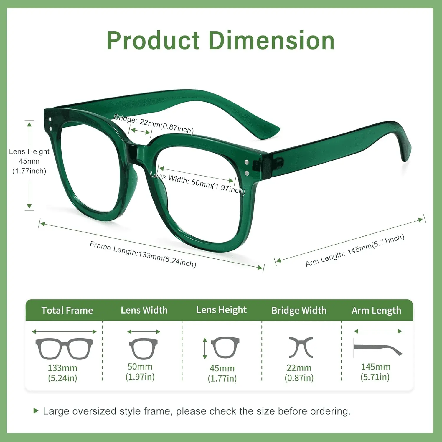 - Product Dimention: Lens width – 50mm,lens height – 45mm,temple length – 145mm,nose bridge – 22mm, suitable for various face.Our chic oversized anti-blue light glasses boast a retro large frame design, so we suggest checking the size to ensure a perfect fit before ordering.
