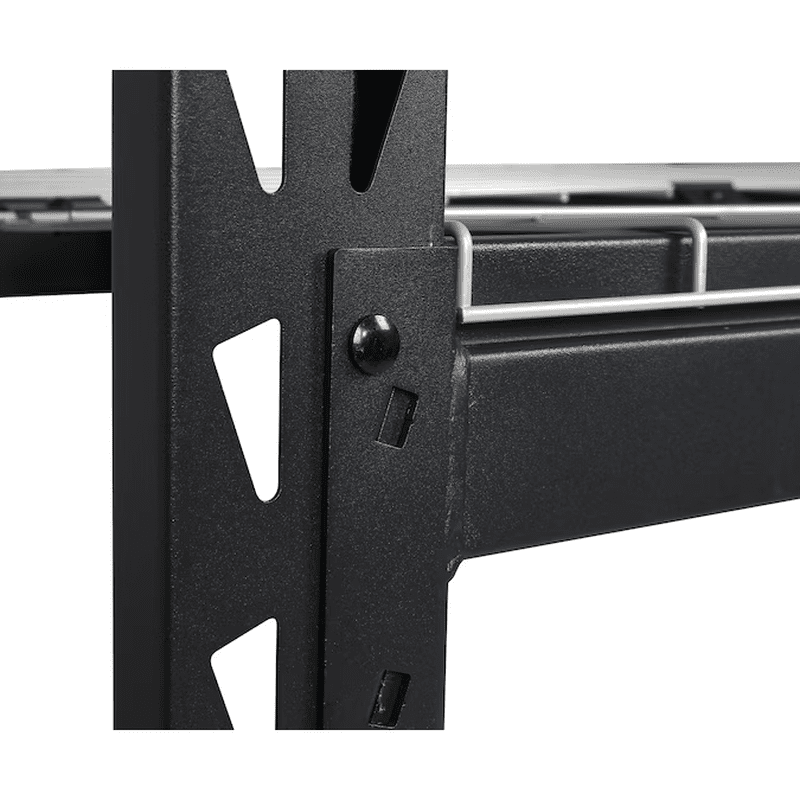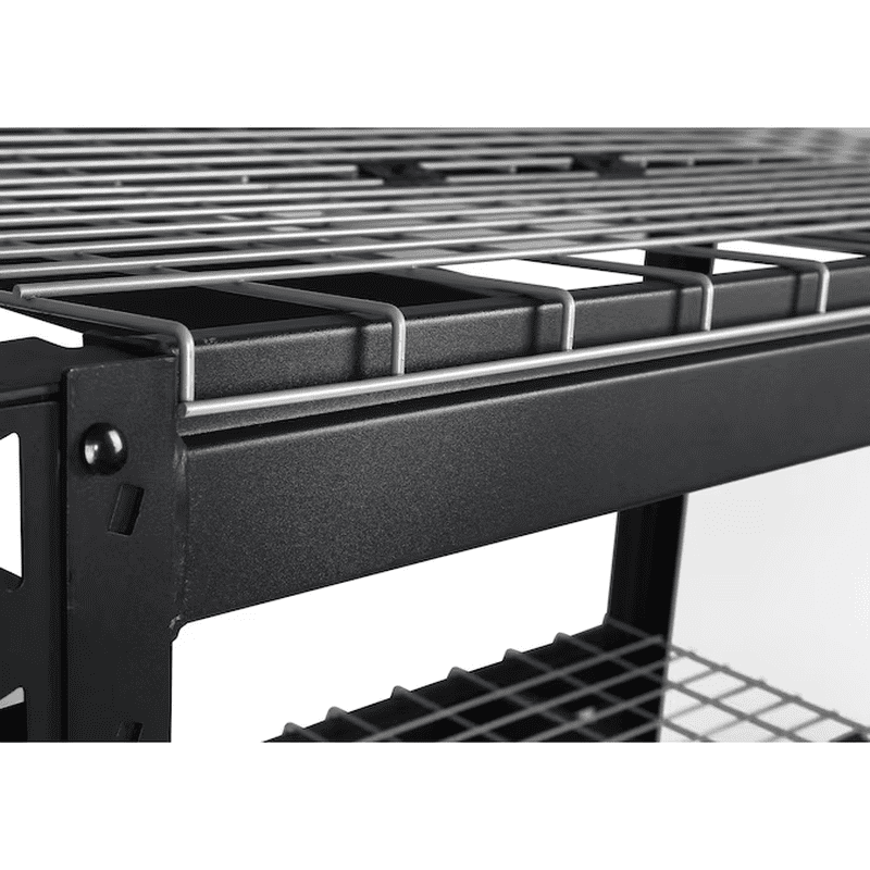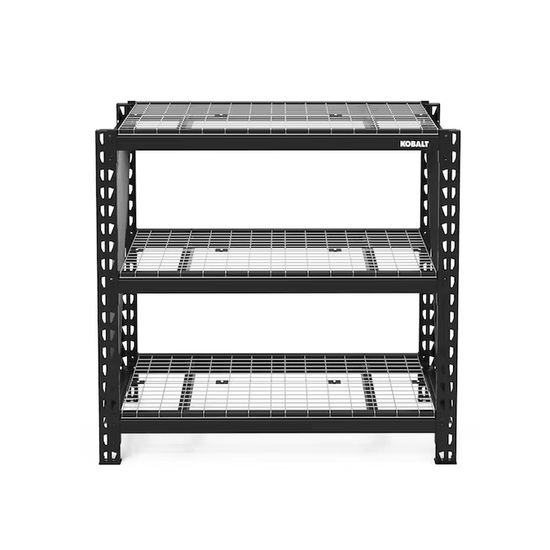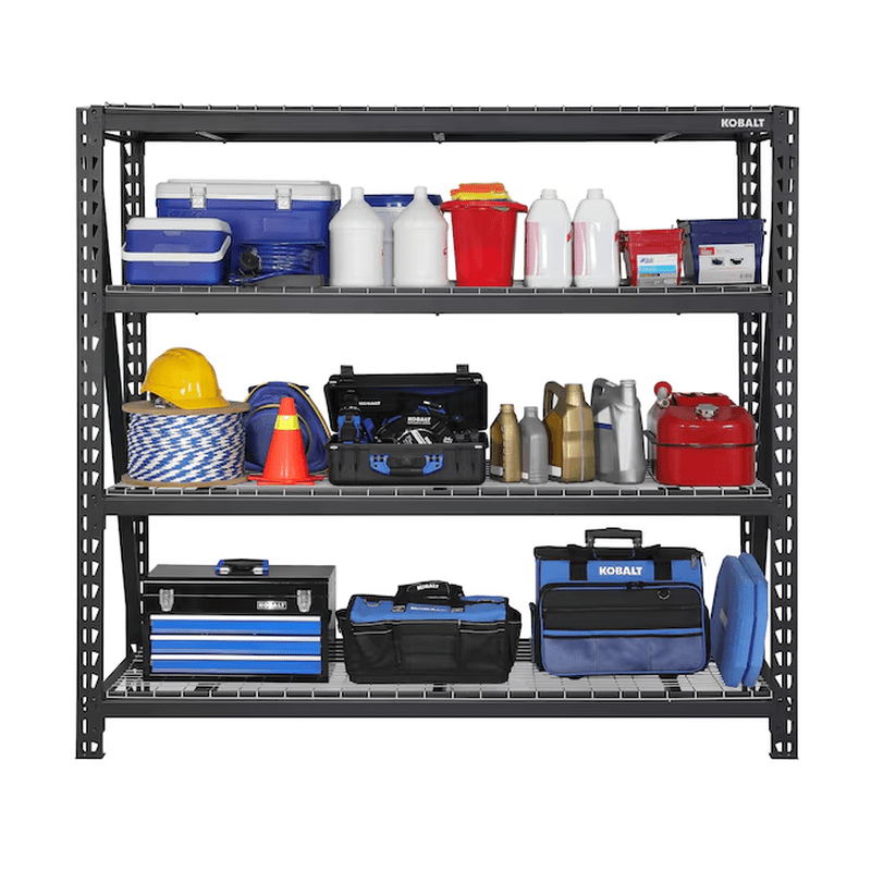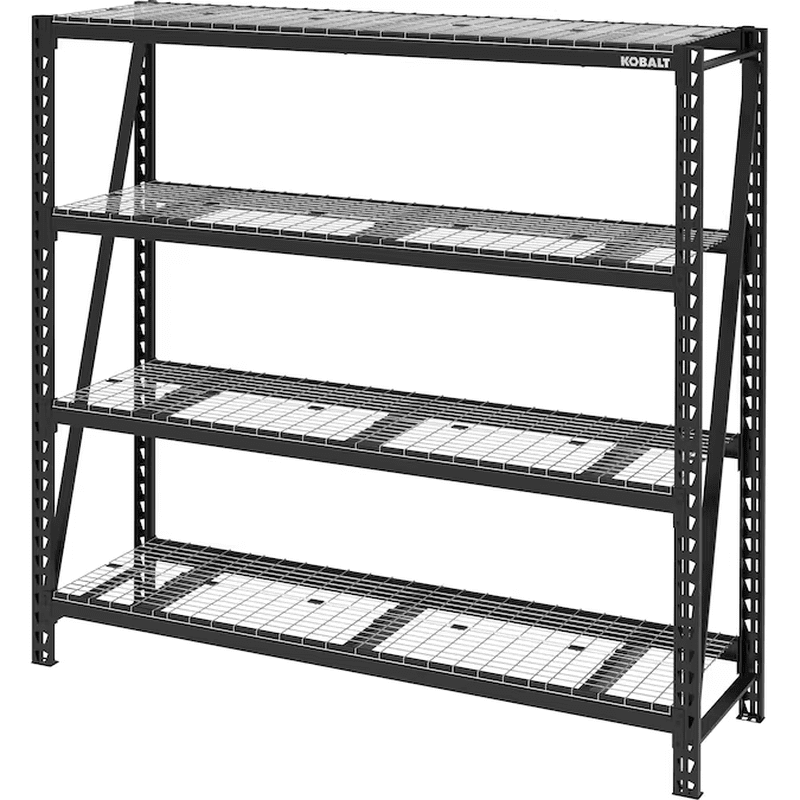 The Kobalt 6-feet tall, 4-tier steel wire deck industrial rack was designed and engineered to provide heavy-duty storage options. Four adjustable wire grid shelves can support up to 1,500 lbs. per shelf with the weights evenly distributed. The product is made from powder-coated steel for corrosion resistance. The shelves are adjustable in 2-1/2-in increments to accommodate your storage needs. Pre-assembled bolts provide easy and quick assembly. Foldable dual wire shelves provide more storage options and compact packaging for easy transportation. Heavy duty feet make the rack more stable and protect flooring from indentations or scratches. Steel locking drop pins and top caps for added safety.