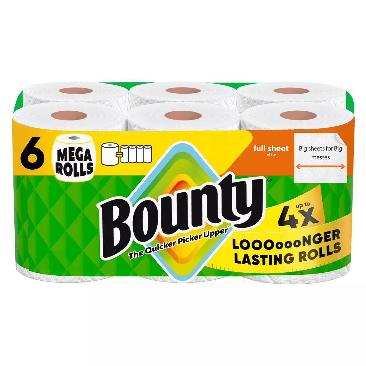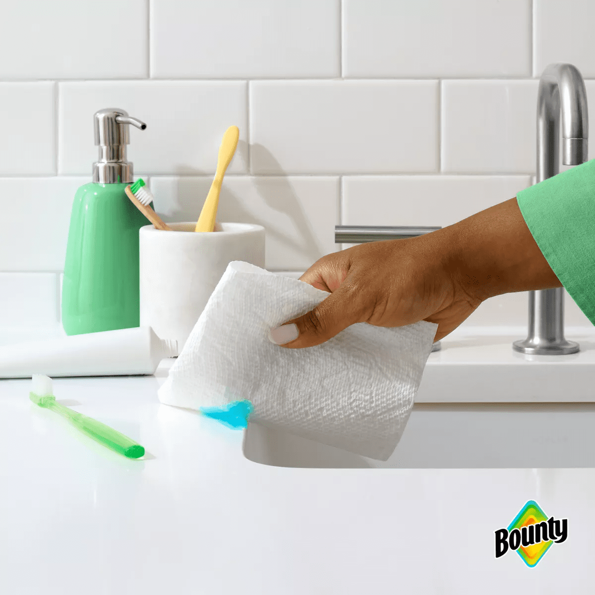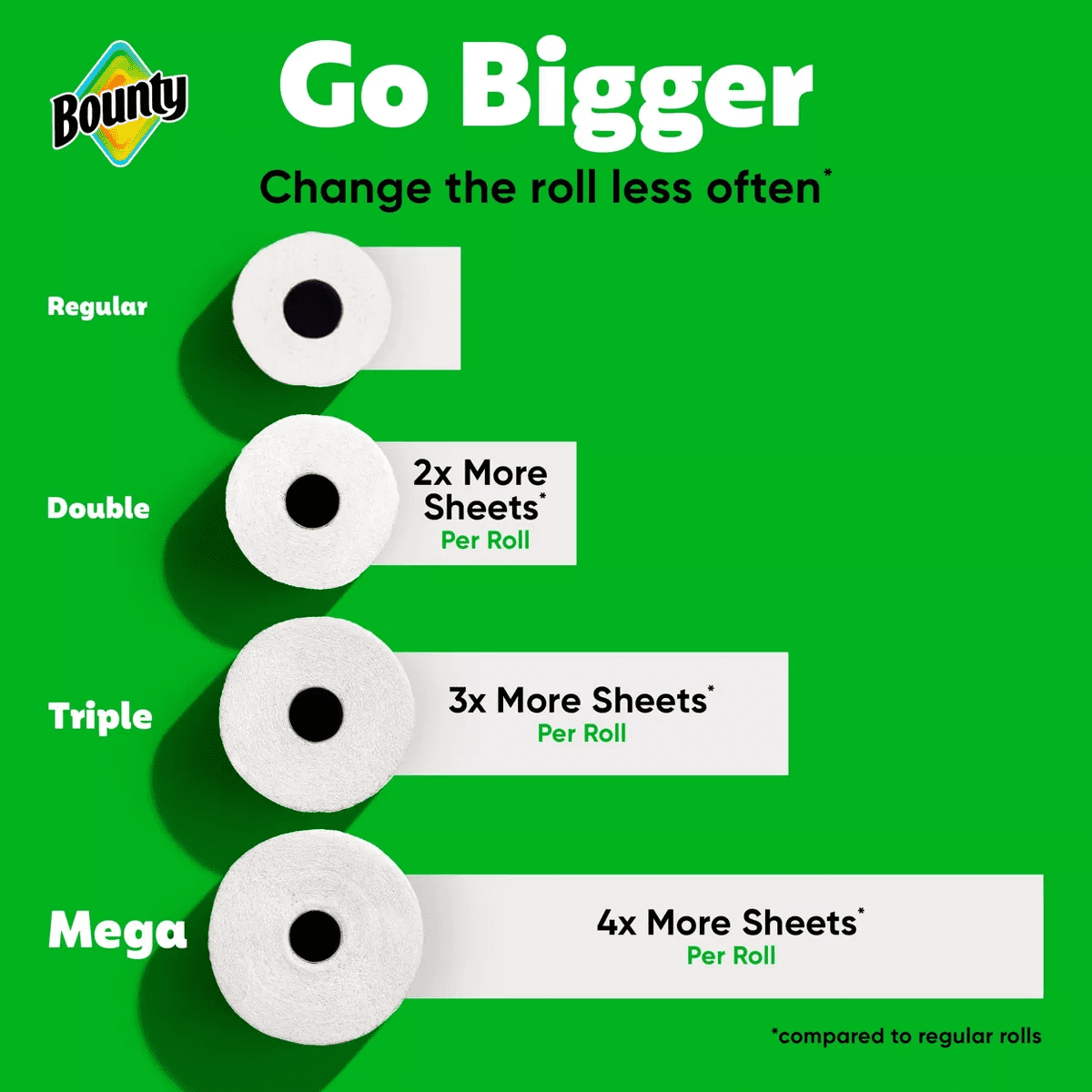 Bounty Paper Towels are 2x more absorbent, so you can clean up messes quicker and use less than the leading ordinary brand. Each sheet has a Durable Diamond Texture to tackle anything from everyday spills to tough projects throughout your home. A variety of pack and rolls sizes are available, and going bigger means you change the roll less often* to always have Bounty on hand. Buy in bulk! Choose from different sheet sizes based on what works best for your needs, including Select-A-Size and Full-Size. You can also change it up with our printed designs.