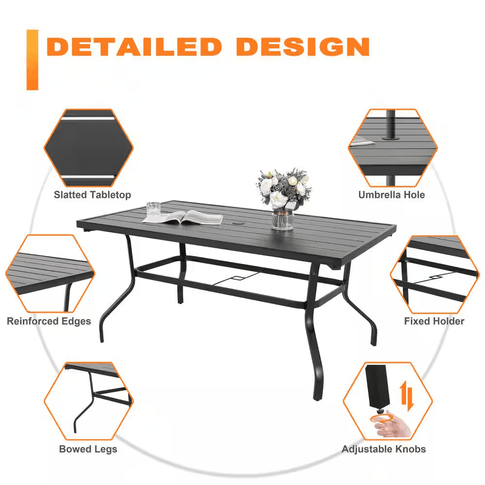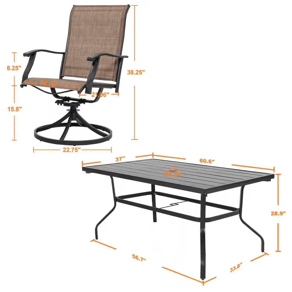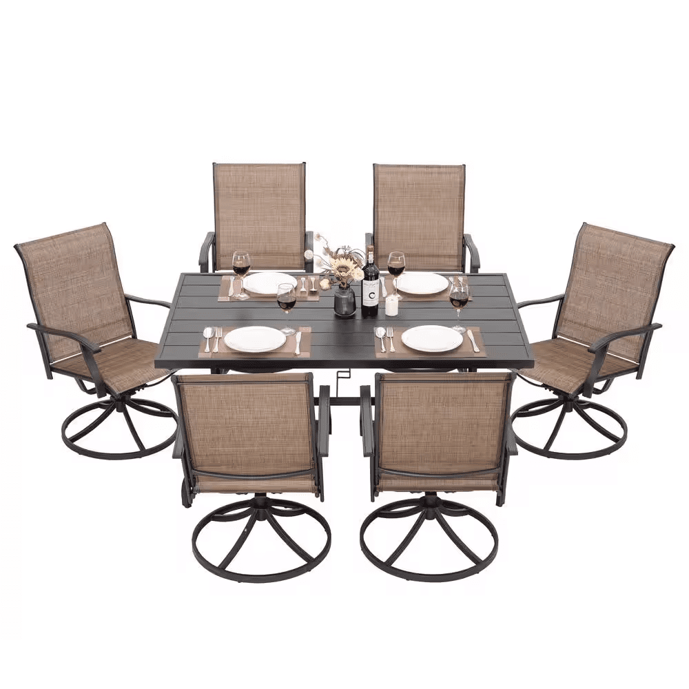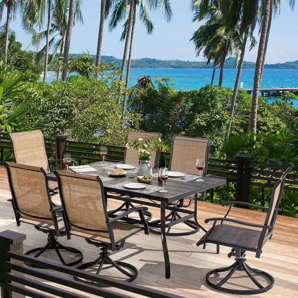 Nuu Garden Outdoor 7-Piece Iron Dining Set is the finishing piece to complete any outdoor space. An admirable marriage of simplicity, refinement, grace, and memory is highly functional and stylishly designed to fit into any room setting. Whetting your appetite for durability and quality are materials that match different weather conditions. Transforming any patio or garden into a welcome retreat from daily life, this fantastic chair with the 360° swivel and gentle rocking allows you to enjoy outdoor living at its finest. This dining set turns your backyard into the perfect place to enjoy the sun and the company of friends and family.