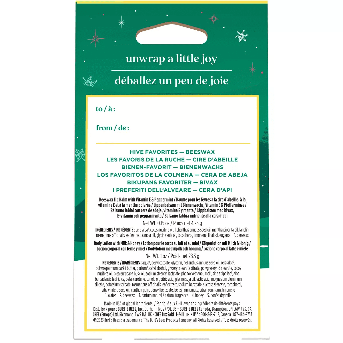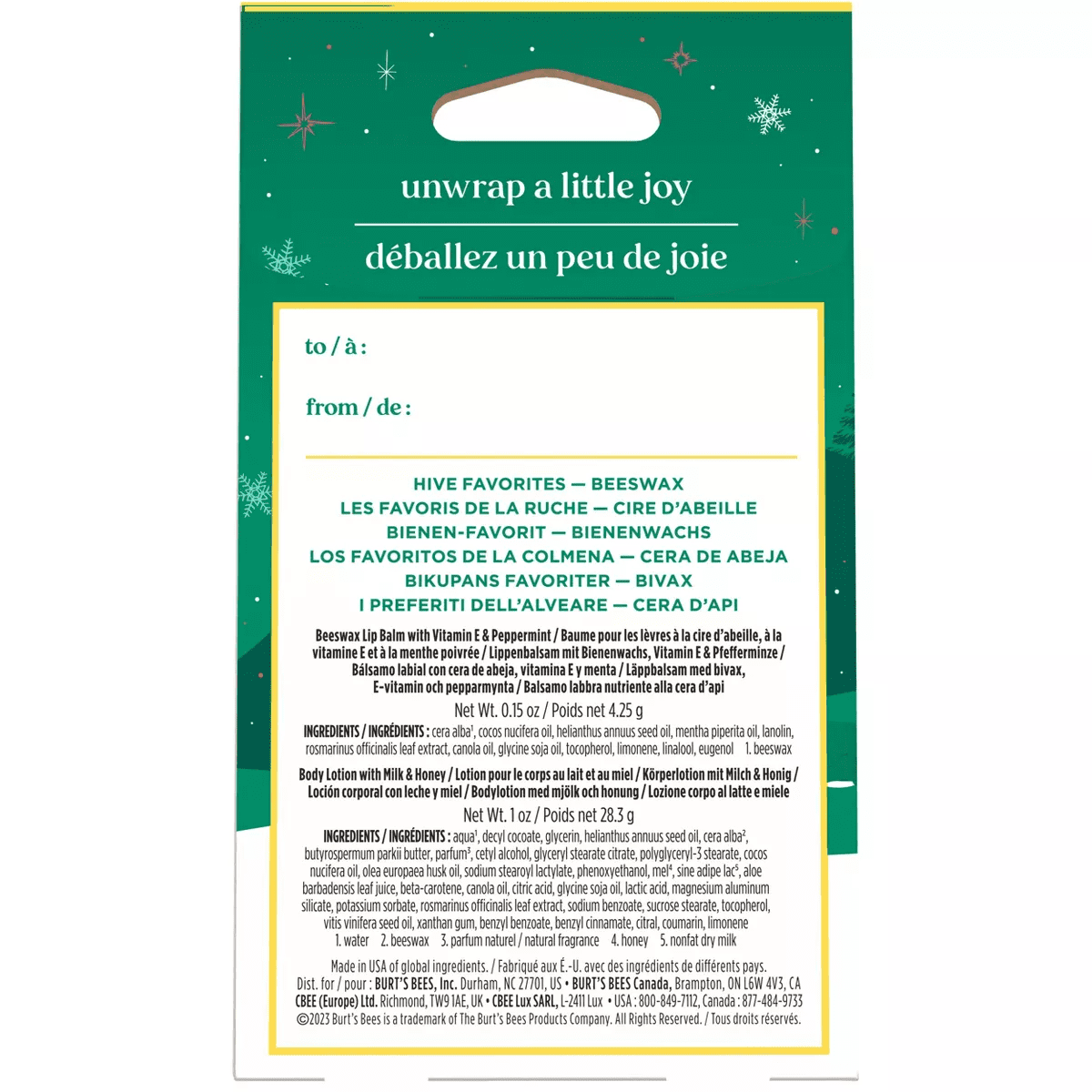 - PACKAGE CONTENTS: One package of Burt’s Bees Hive Favorites contains one moisturizing body lotion and one Beeswax lip balm in holiday-themed packaging that fits in your holiday gift baskets or present