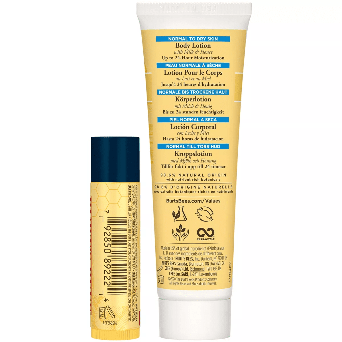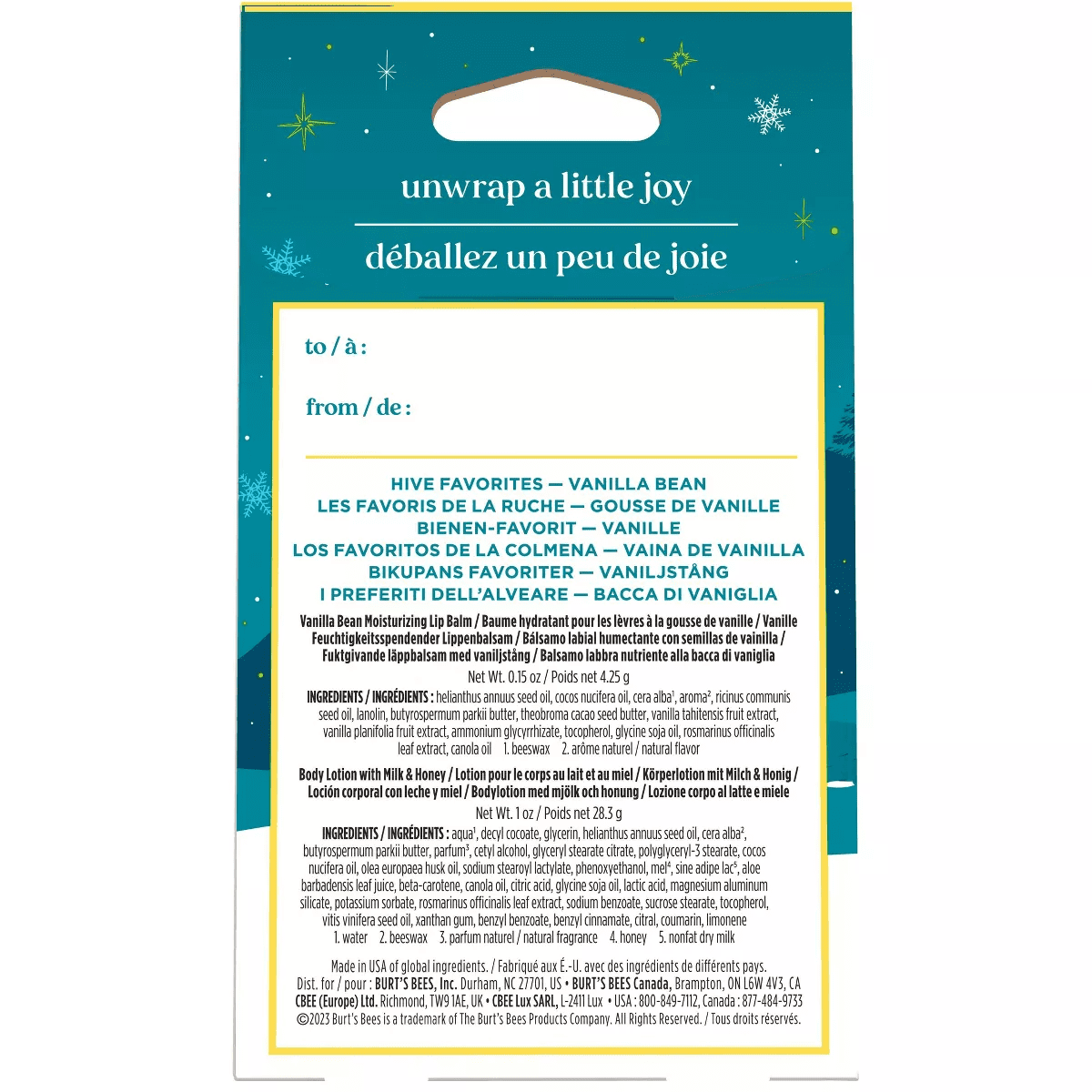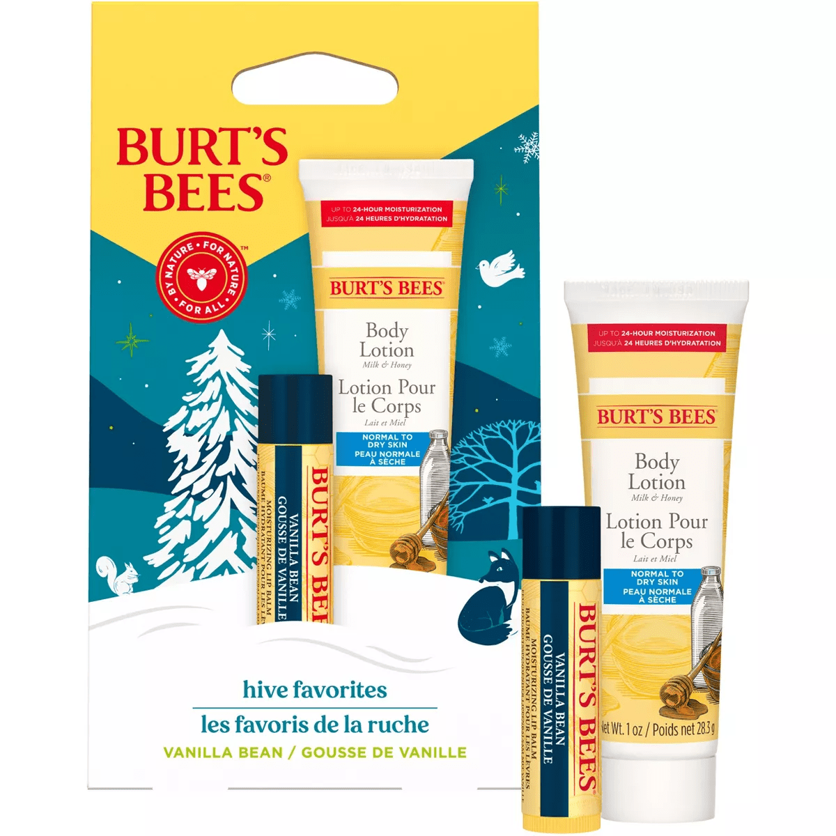 - GREAT CHRISTMAS GIFTS: One Burt’s Bees Hive Favorites Gift Set that includes Vanilla Bean Lip Balm and Milk and Honey Body Lotion in festive packaging that’s ready for gifting