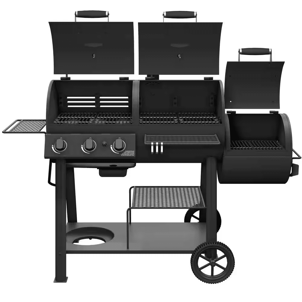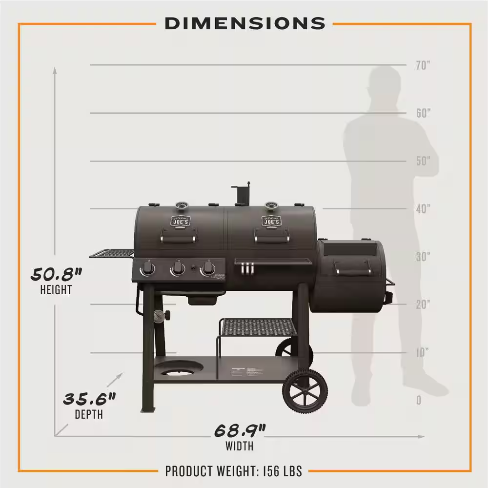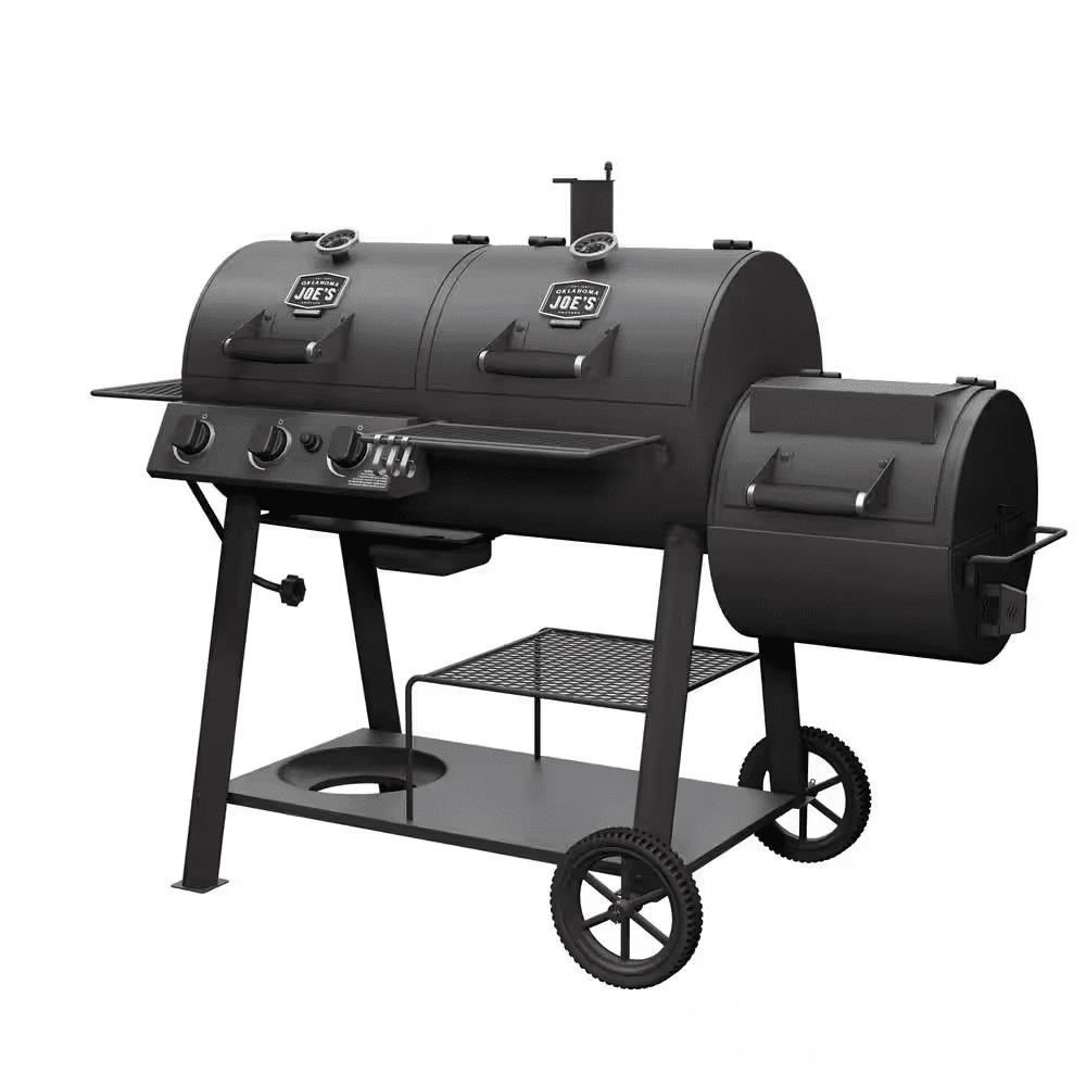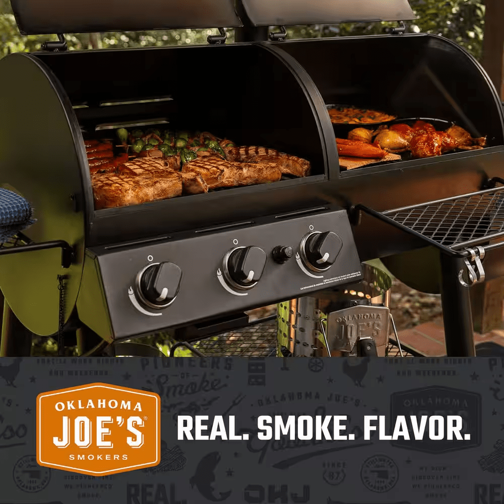 The Oklahoma Joes Canyon Combo Grill and Smoker gives you the real smoke flavor you crave alongside the chargrilled flavor you love. Cook a juicy steak low and slow on the smoker and finish it off with a quick reverse-sear on the gas grill. When you’re hungry now and don’t want to wait, just fire up the gas grill and start cooking. No matter what you’re craving, the Oklahoma Joes Canyon Combo Grill and Smoker delivers. Redesigned to improve your smoking and grilling experience, the Canyon Combo now has pivoting cool touch handles, an easy-access ash pan and rubber treads on the wheels. There are tool hooks, a charcoal basket and a robust staging shelf.