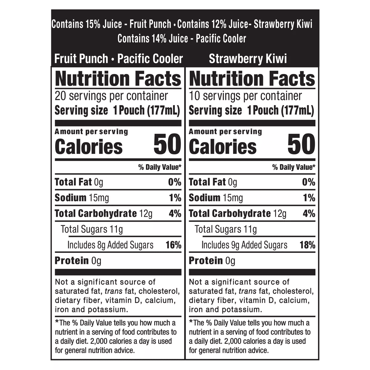 - CAPRI SUN POUCHES: One box of Capri Sun Fruit Punch, Strawberry Kiwi and Pacific Cooler Flavored Juice Drink Blend Variety Pack (30 ct 6 fl oz pouches)