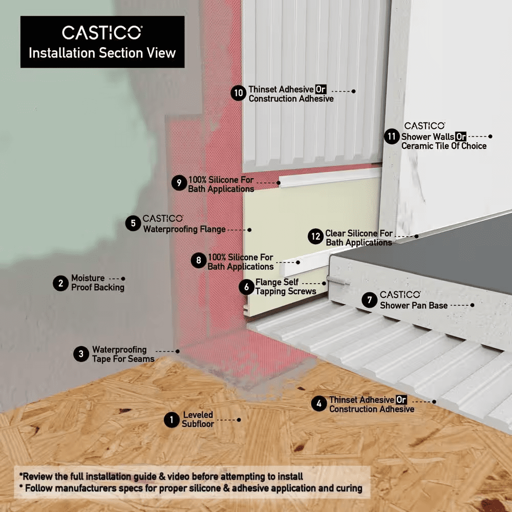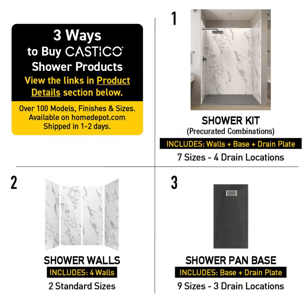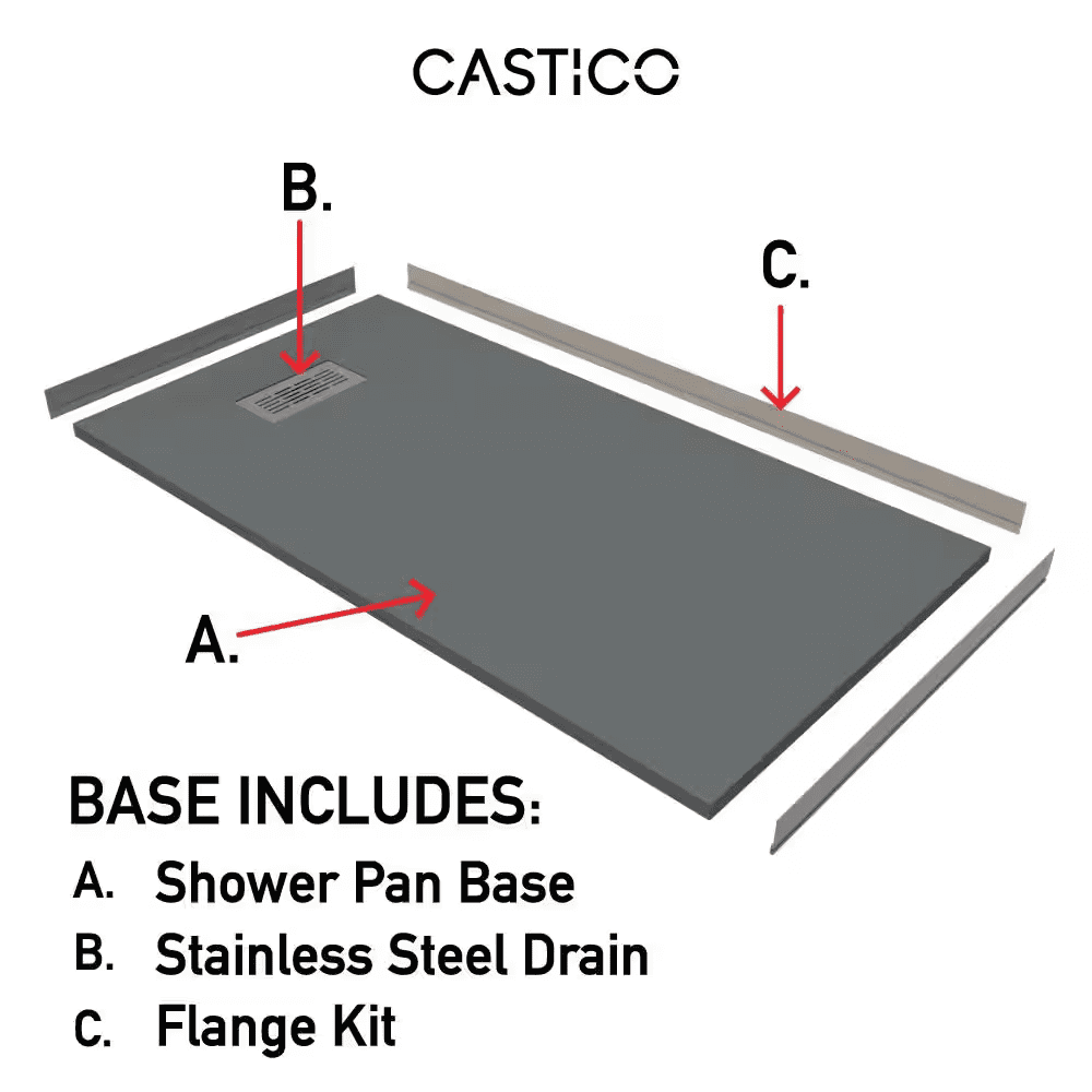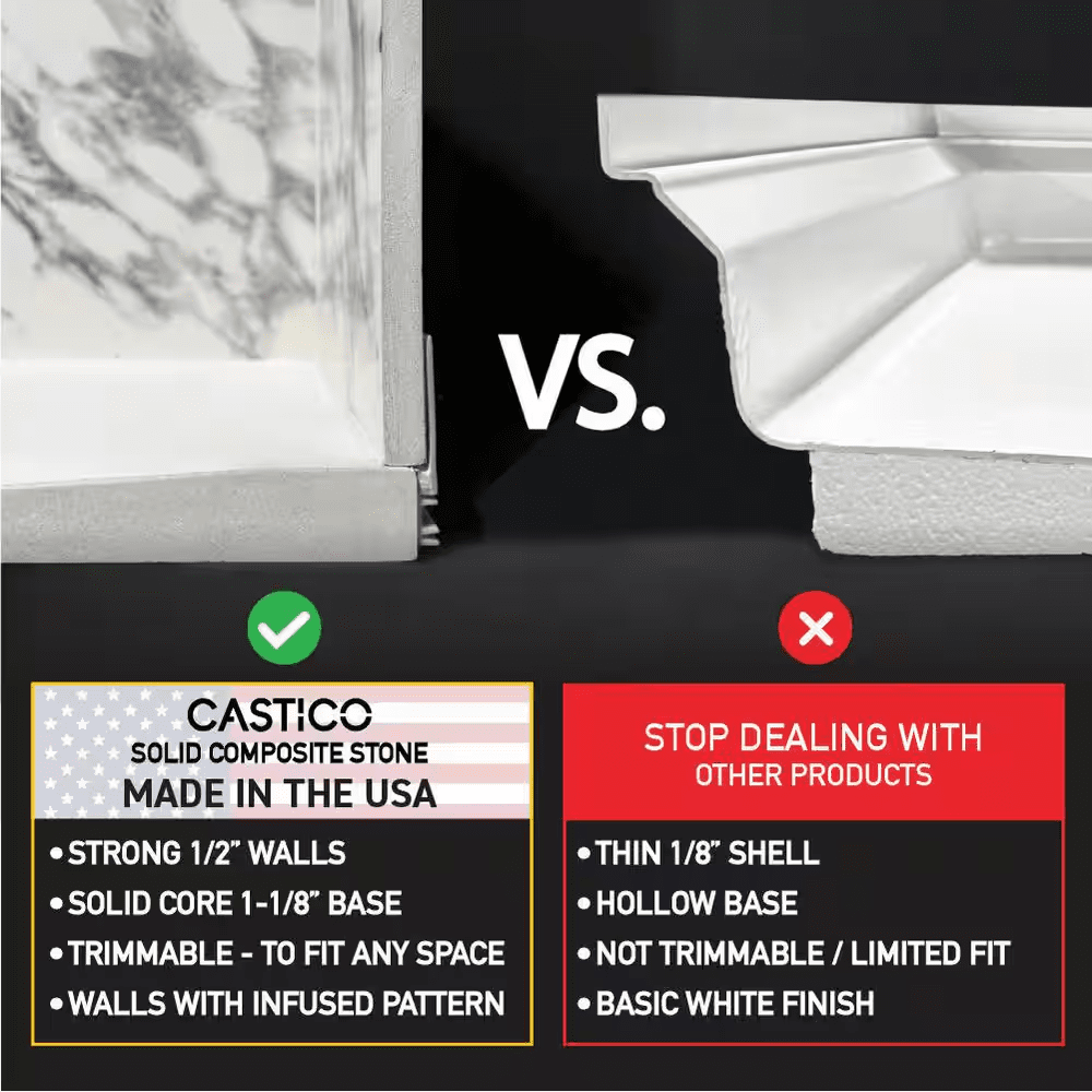 Transform your bathroom with the CASTICO Alcove Shower Kit, expertly crafted from Solid Composite Stone for durability, style, and efficiency. Every CASTICO product is built to last and backed by a limited lifetime warranty for added confidence. This kit features a pre-sloped, slip-resistant solid composite stone shower base paired with beautifully finished, grout-free wall panels that resist stains and scratches. The walls panels are simple to install and can be cut to fit around niches and windows. The curb-less, low-step base and seamless design deliver modern elegance and accessibility, making it an ideal choice for both contractors and DIY enthusiasts