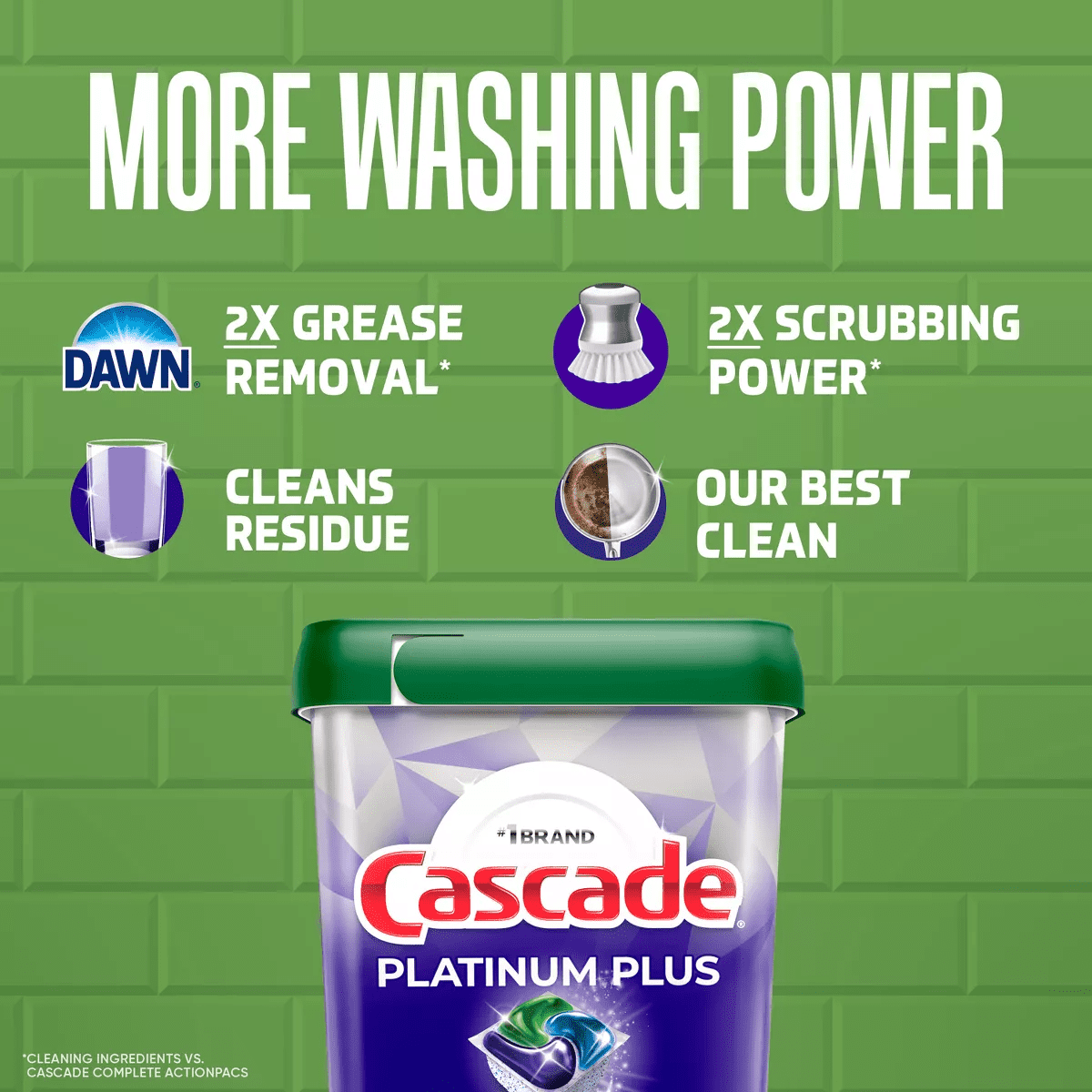 - Only Cascade Platinum Plus contains 2X* the Dawn grease fighting power and 2X* the scrubbing power to power through dried on food *Cleaning ingredients vs Cascade Complete ActionPacs