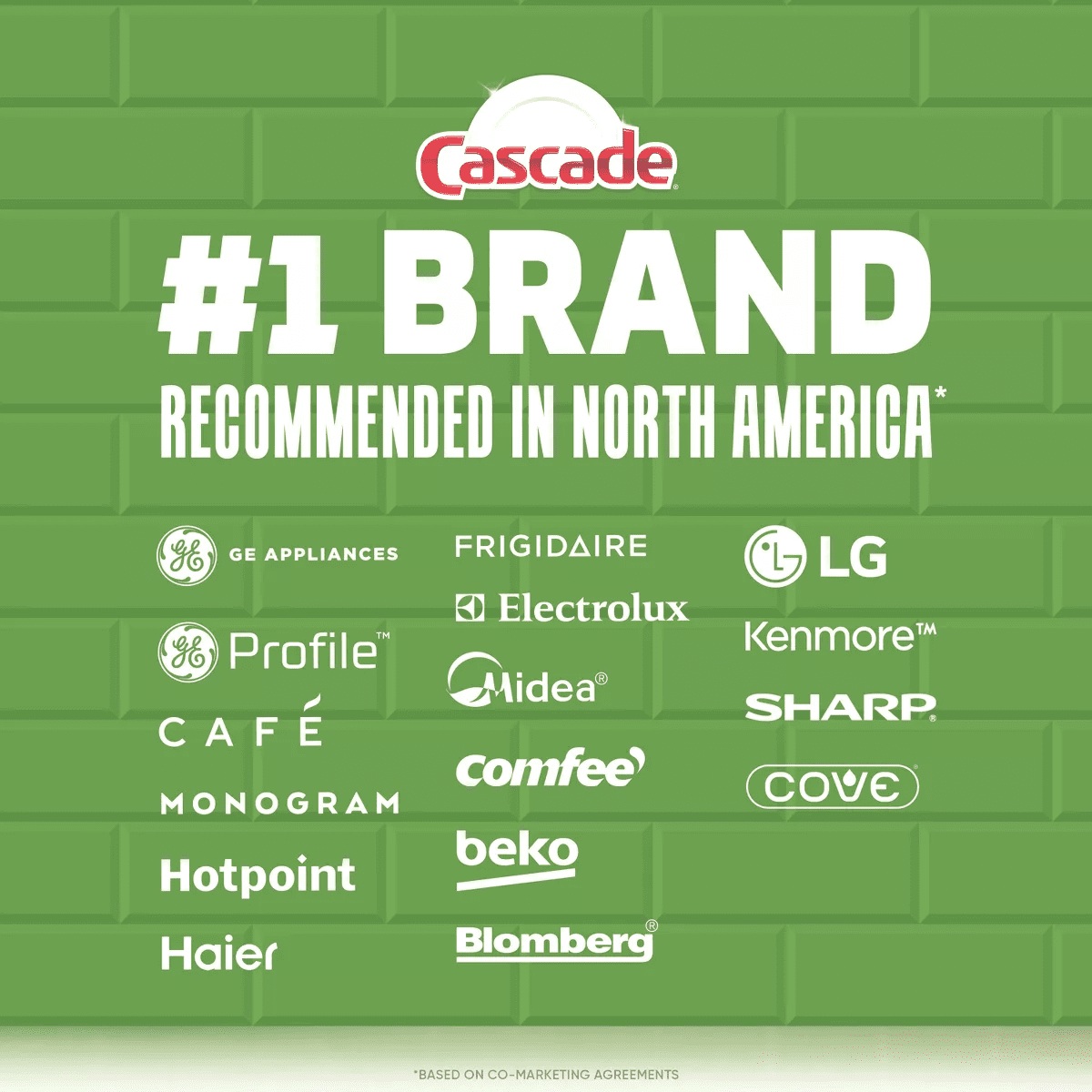 - #1 Recommended Brand in North America* *More dishwasher brands in North America recommend Cascade based on co-marketing agreements vs. other automatic dishwasher detergent brands