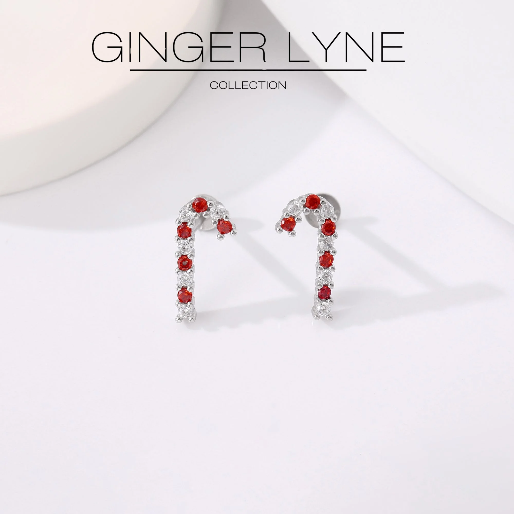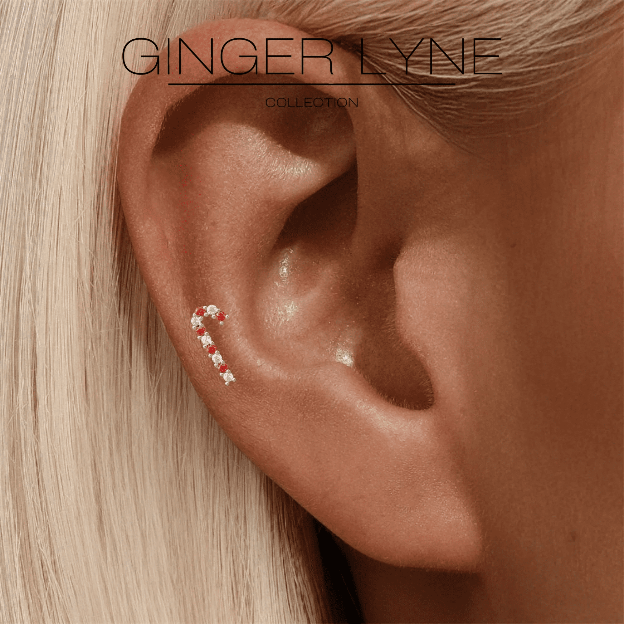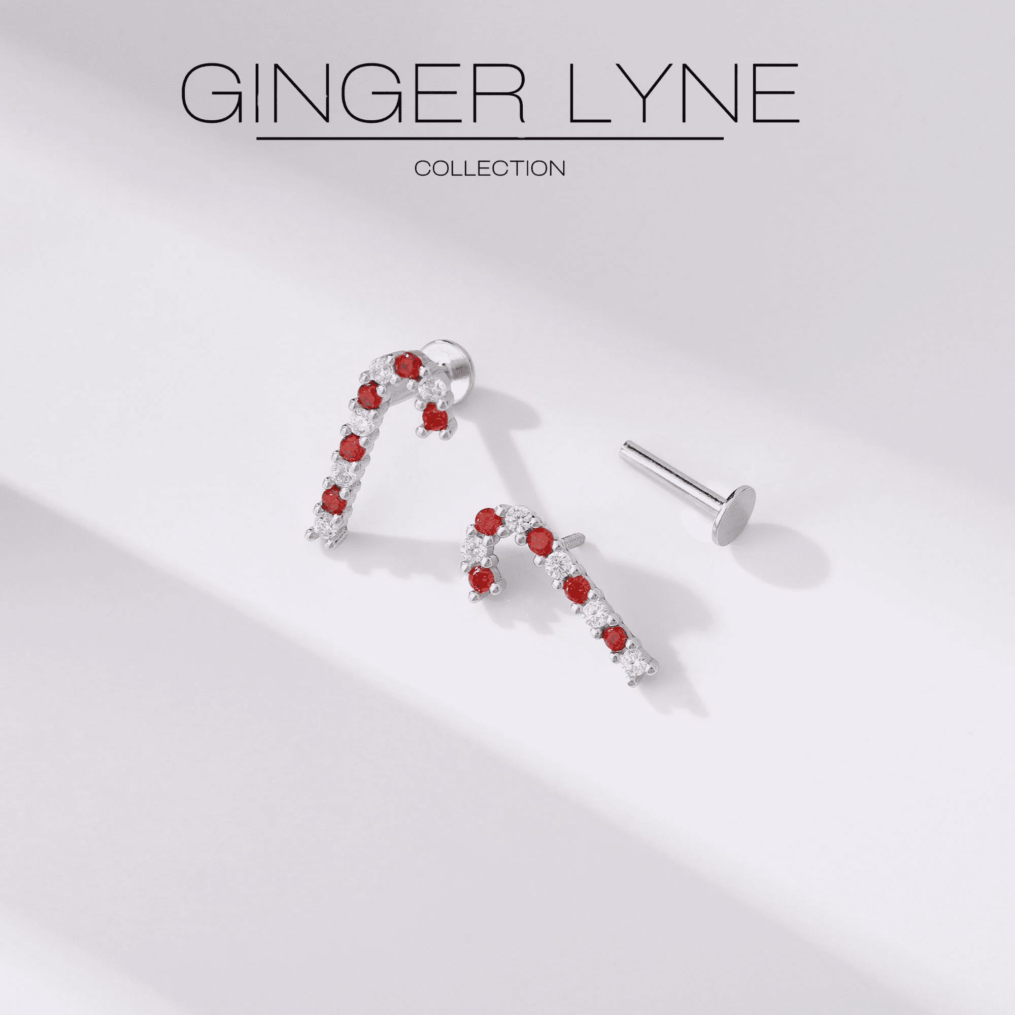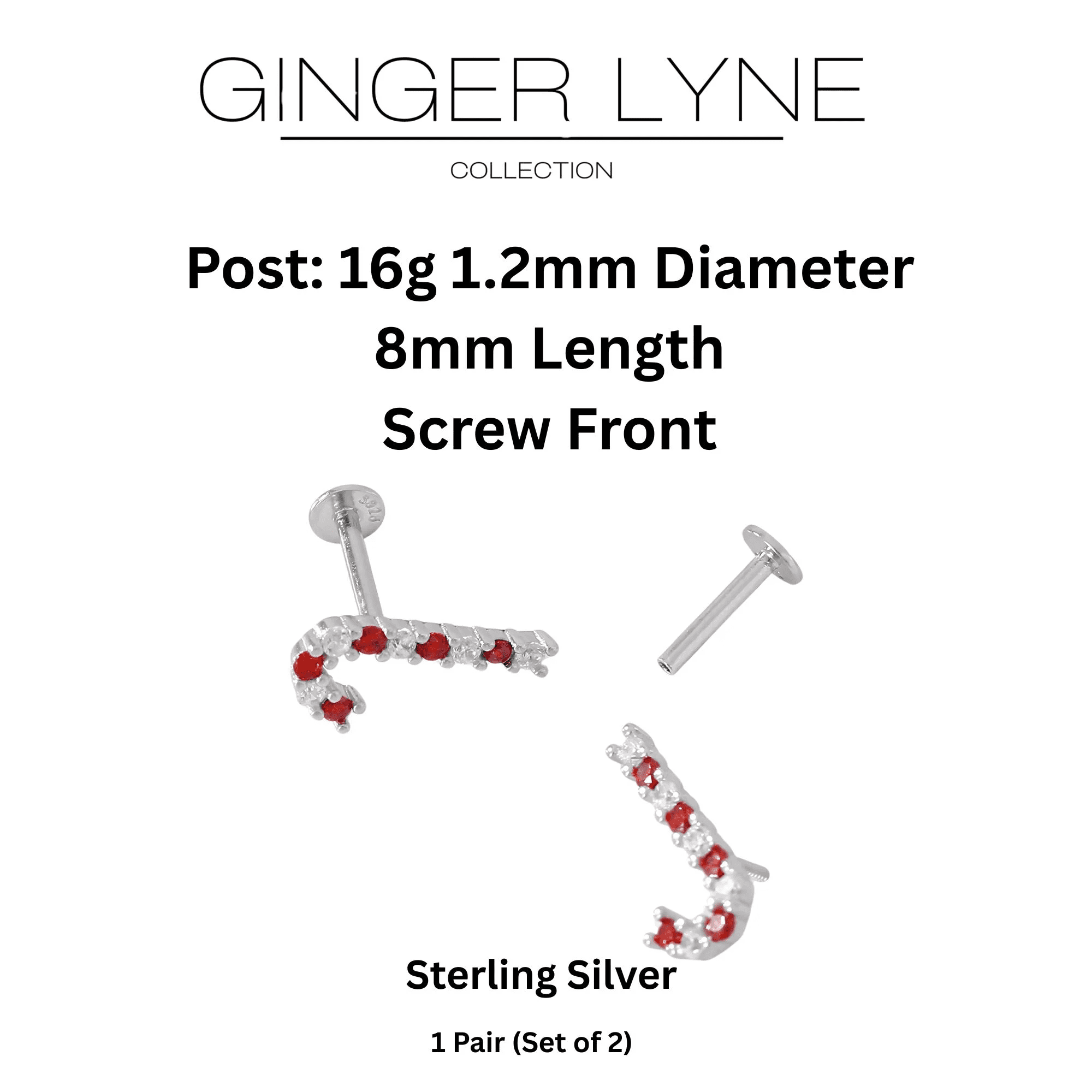 Celebrate the holiday season or show off your love of festive style year-round with these Flat Back Candy Cane Earrings from the Ginger Lyne Collection. Expertly crafted in solid sterling silver and finished in rhodium plating for extra shine and durability, these earrings bring whimsical charm with their mirror-imaged candy cane shapes. Sparkling red and clear cubic zirconia stones line the 14mm candy cane design for eye-catching brilliance. The post is a comfortable 1.2mm thick (16 gauge) and 8mm long, making these earrings perfect for a wide range of ear piercings. Designed with a screw-on front and smooth flat back, these sleepers are a top choice for those who want comfort while sleeping or wearing them all day. Flat back earrings are popular for their secure, low-profile design and are ideal for helix, cartilage, tragus, conch, lobe, forward helix, flat, or second ear piercings. Sold as a pair with left and right orientation for a perfectly mirrored set, these earrings are a thoughtful and unique gift for anyone who loves playful jewelry with a festive flair. Whether dressing up for Christmas or looking to add a pop of color and sparkle to your ear stack, these earrings combine style, comfort, and personality in one perfect pair.