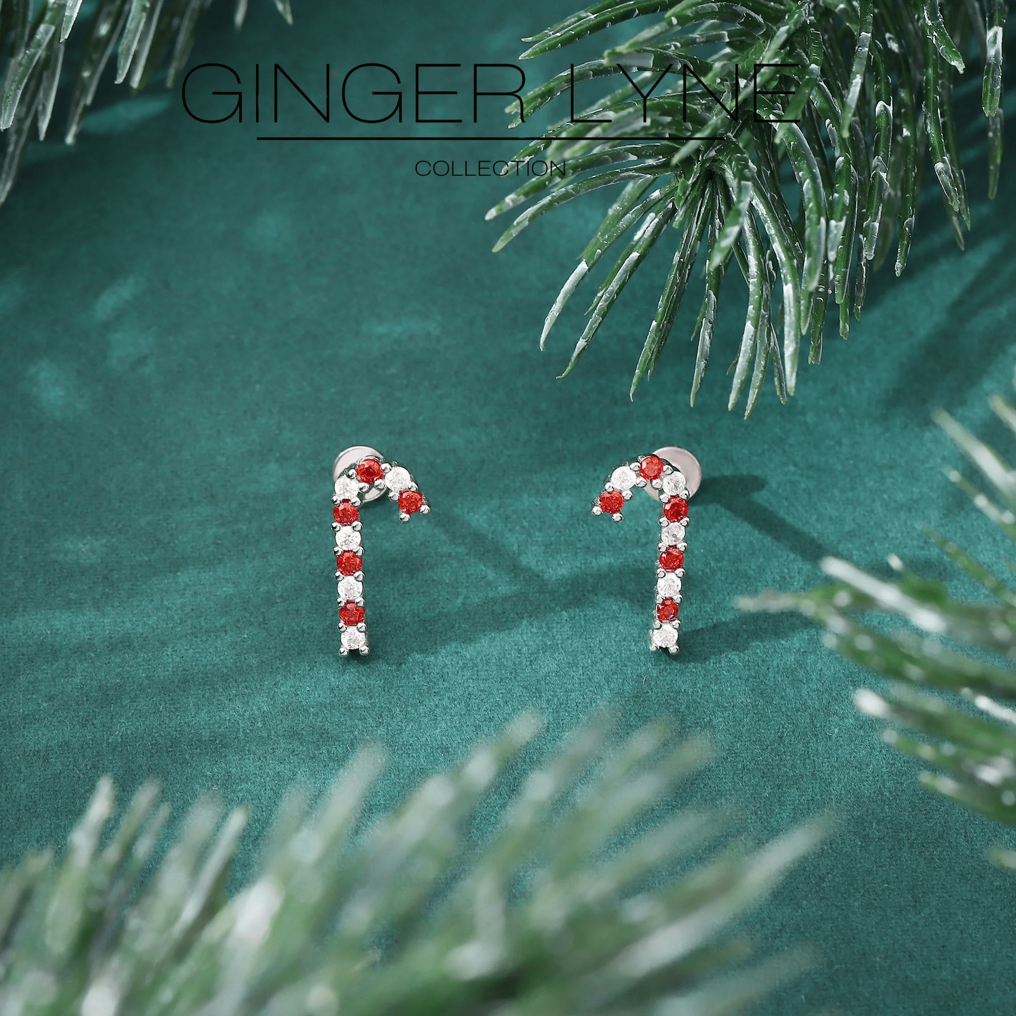 - Flat Back Candy Cane Earrings for Pierced Ears – Festive sterling silver design with red and clear cubic zirconia stones shaped as mirrored candy canes adds charm to your ear stack or holiday look