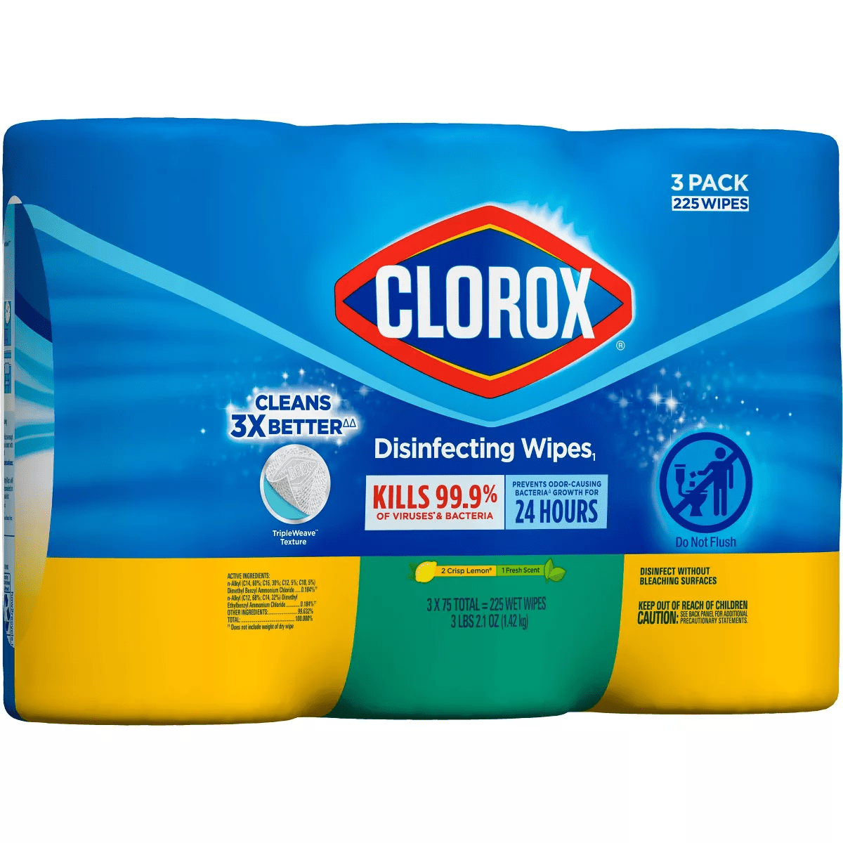 Clorox Disinfecting Wipes with TripleWeave texture kill germs, cleans tough messes and removes 99.9% of allergens on surfaces like kitchen counters bathroom surfaces and more. Disinfecting Wipes clean and disinfect with antibacterial power that kills 99.9% of viruses and bacteria that can live on surfaces, including COVID-19* Virus, staph, E. coli, MRSA, salmonella, strep and Kleb. These all-purpose disposable wipes can prevent the growth of bacteria* for up to 24 hours. Wipes are safe to use on finished wood, sealed granite and stainless steel. Clean with bleach-free wipes to keep dirt and germs away. Do not flush. * Kills COVID-19 virus: kills SARS-CoV-2 on hard, nonporous surfaces. Use as directed. Vs. a paper towel. Prevents the growth of bacteria: odor causing bacteria on non-food contact surfaces. Allow product to air dry. USAGE DIRECTIONS: Directions for Use: It is a violation for Federal law to use this product in a manner inconsistent with its labeling. To clean and remove allergens: Wipe surface clean with this product. Let air dry. To disinfect and deodorize hard, nonporous surfaces: Wipe surface; use enough wipes for treated surface to remain visibly wet for 4 minutes. Let surface dry. For highly soiled surfaces, clean excess dirt first. For surfaces that may come in contact with food, a potable water rinse is required. This product is not for use on dishes, glassware or eating utensils. Not for cleaning or sanitizing skin. Do not use as a diaper wipe or for personal cleansing. Clorox Disinfecting Wipes will not harm most surfaces including acrylic, sealed fiberglass, sealed granite and finished hardwood. Not recommended for use on unpainted wood and unfurnished, unsealed, waxed, oiled or worn surfaces. Test a small area first. CAUTION STATEMENTS: PRECAUTIONARY STATEMENTS: HAZARDS TO HUMAN AND DOMESTIC ANIMALS. CAUTION: Cases of moderate eye irritation. Avoid contact with eyes or clothing. Wash thoroughly with soap and water after handling. FIRST AID: IF IN EYES: Hold eye open and rinse slowly and gently with water 15-20 minutes. Remove contact lenses, if present, after the first 5 minutes, then continue rinsing eye. Call a poison control center for treatment advice. Have the product container or label with you when calling a poison control center or doctor, or going for treatment. PHYSICAL OR CHEMICAL HAZARDS: Do not use or store near heat or open flame.
