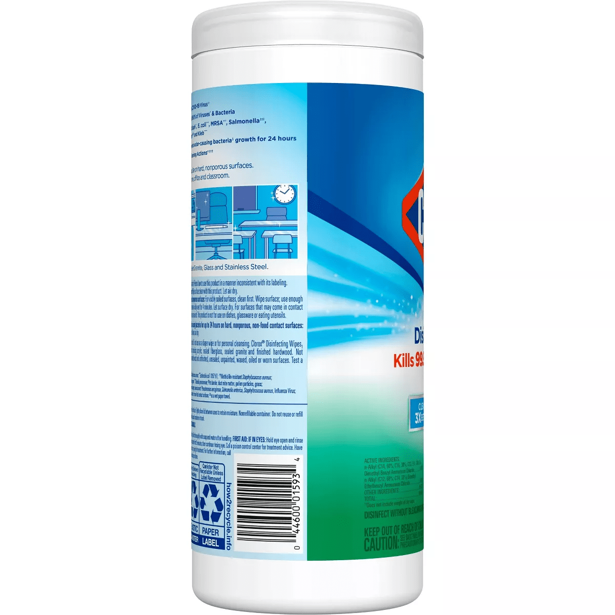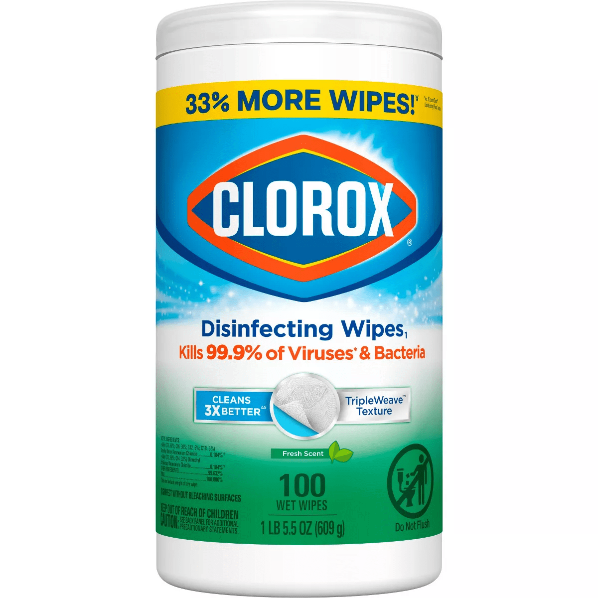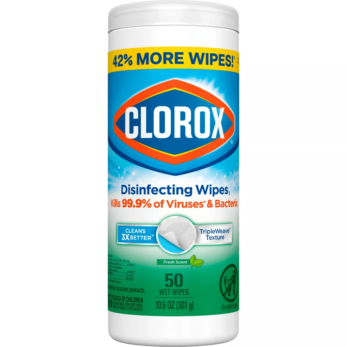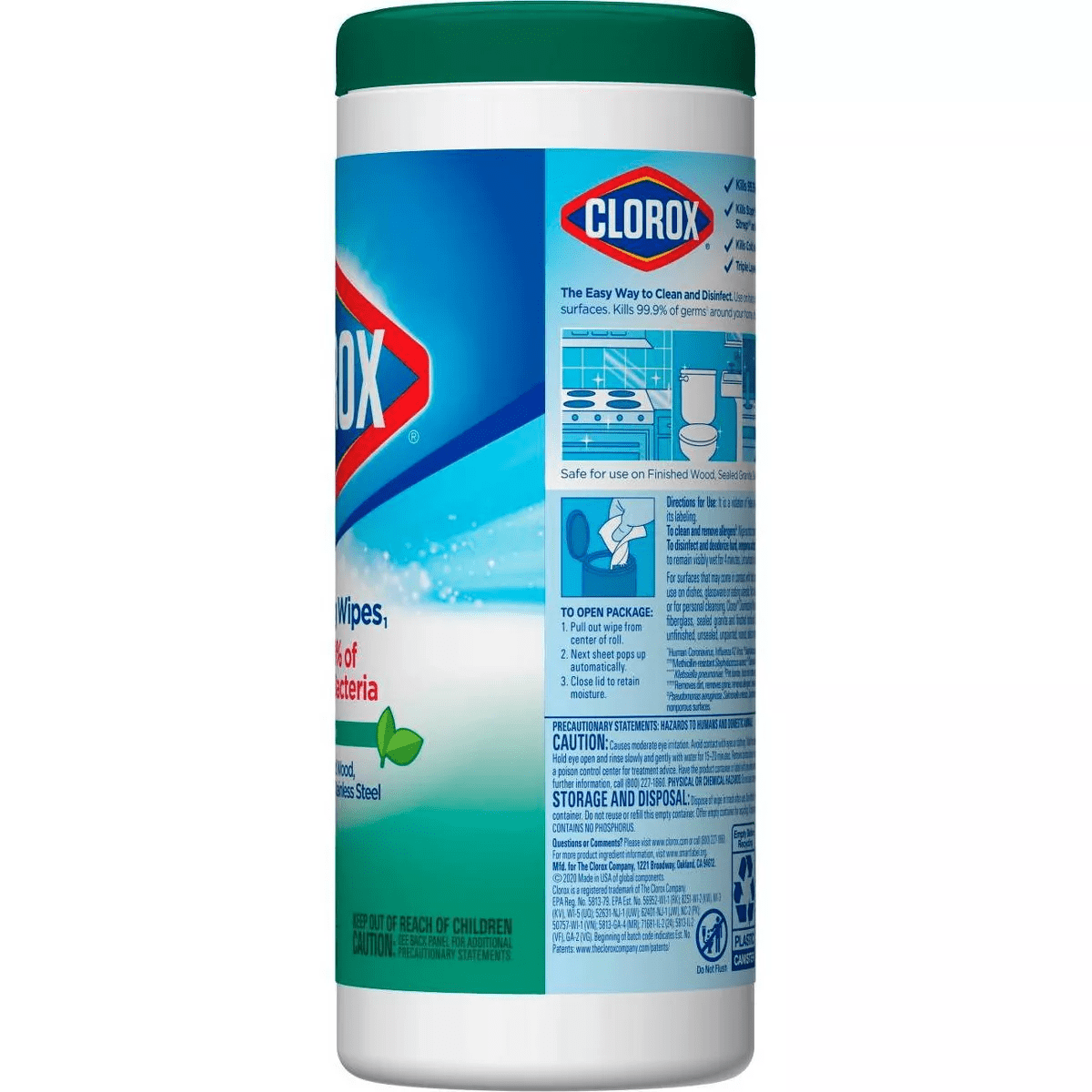 Clorox Disinfecting Wipes with TripleWeave texture kill germs, cleans tough messes and removes 99.9% of allergens on surfaces like kitchen counters bathroom surfaces and more. Disinfecting Wipes clean and disinfect with antibacterial power that kills 99.9% of viruses and bacteria that can live on surfaces, including COVID-19* Virus, staph, E. coli, MRSA, salmonella, strep and Kleb. These all-purpose disposable wipes clean 3x better* and remove common allergens, germs and messes on surfaces like kitchen counters, bathroom surfaces and more and can prevent the growth of bacteria* for up to 24 hours. Wipes are safe to use on finished wood, sealed granite and stainless steel. Clean with bleach-free wipes to keep dirt and germs away. Do not flush. * Kills COVID-19 virus: kills SARS-CoV-2 on hard, nonporous surfaces. Use as directed. Vs. a paper towel. Prevents the growth of bacteria: odor causing bacteria on non-food contact surfaces. Allow product to air dry. USAGE DIRECTIONS: Directions for Use: It is a violation for Federal law to use this product in a manner inconsistent with its labeling. To clean and remove allergens: Wipe surface clean with this product. Let air dry. To disinfect and deodorize hard, nonporous surfaces: Wipe surface; use enough wipes for treated surface to remain visibly wet for 4 minutes. Let surface dry. For highly soiled surfaces, clean excess dirt first. For surfaces that may come in contact with food, a potable water rinse is required. This product is not for use on dishes, glassware or eating utensils. Not for cleaning or sanitizing skin. Do not use as a diaper wipe or for personal cleansing. Clorox Disinfecting Wipes will not harm most surfaces including acrylic, sealed fiberglass, sealed granite and finished hardwood. Not recommended for use on unpainted wood and unfurnished, unsealed, waxed, oiled or worn surfaces. Test a small area first. CAUTION STATEMENTS: PRECAUTIONARY STATEMENTS: HAZARDS TO HUMAN AND DOMESTIC ANIMALS. CAUTION: Cases of moderate eye irritation. Avoid contact with eyes or clothing. Wash thoroughly with soap and water after handling. FIRST AID: IF IN EYES: Hold eye open and rinse slowly and gently with water 15-20 minutes. Remove contact lenses, if present, after the first 5 minutes, then continue rinsing eye. Call a poison control center for treatment advice. Have the product container or label with you when calling a poison control center or doctor, or going for treatment. PHYSICAL OR CHEMICAL HAZARDS: Do not use or store near heat or open flame.