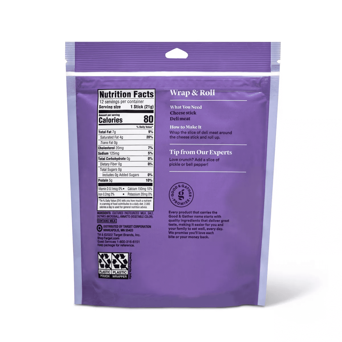 These Colby Jack Cheese Sticks from Good & Gatherâ„¢ are sure to become one of your favorite go-to snacks for busy days. Made from a blend of Colby and Monterey Jack cheese, these cheese sticks have a delicious, creamy taste you’ll love. A good source of calcium*, each stick also contains 5 grams of protein, and the cheese is made from milk from non-rBST-treated cows. Each 9-ounce pack contains 12 cheese sticks, making it easy to snack on them again and again — and for a fun twist, you can try wrapping the sticks in deli meat slices and adding lettuce or pickles for some tasty crunch.