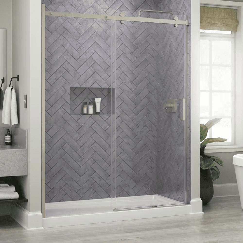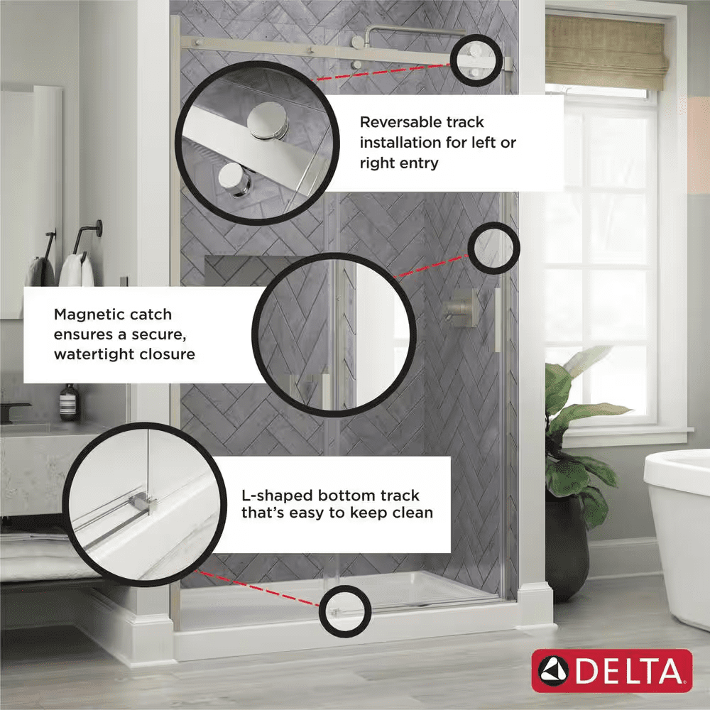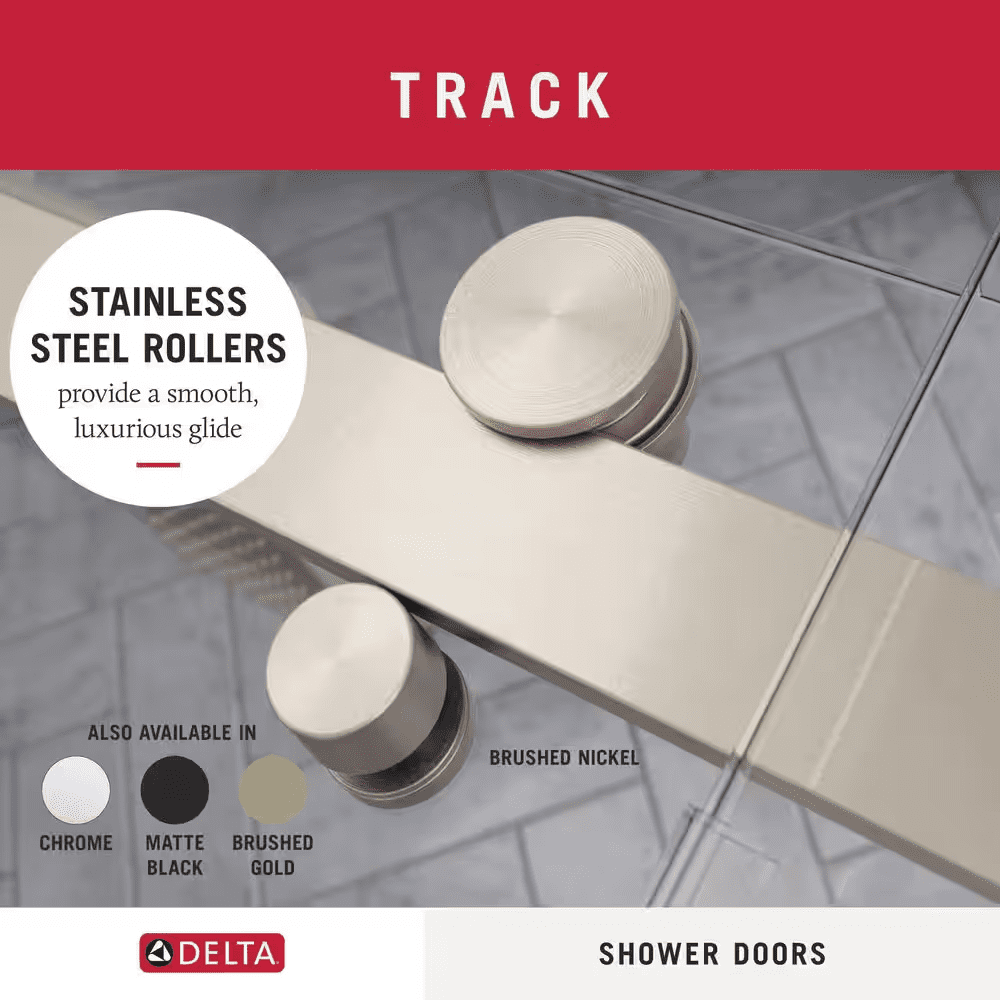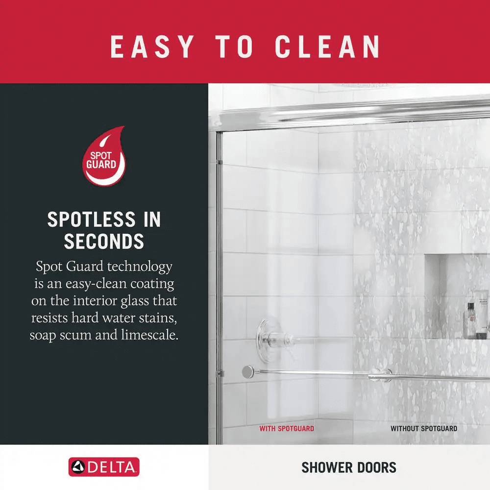The Delta Commix shower door is a quietly sophisticated design that complements a range of contemporary bathrooms. The warm and welcoming barn door style, along with plenty of transparency, makes this simple combination feel extraordinary. Upgraded 8mm glass panels provide a substantial feel with a comfortable slide. Spot Guard technology keeps your glass sparkling. This proprietary coating resists water spots and other unsightly build-up to make cleaning effortless.