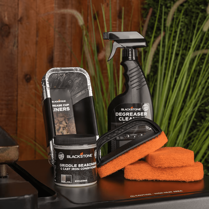 - Complete griddle care kit includes (1) 6.5-oz griddle conditioner and seasoning balm, (1) 16-oz degreaser cleaner, (1) 10-pack of grease cup liners, and (1) reusable scrub handle with 3 scrub pads