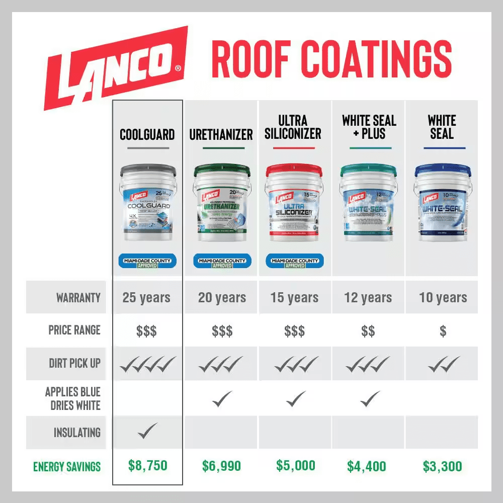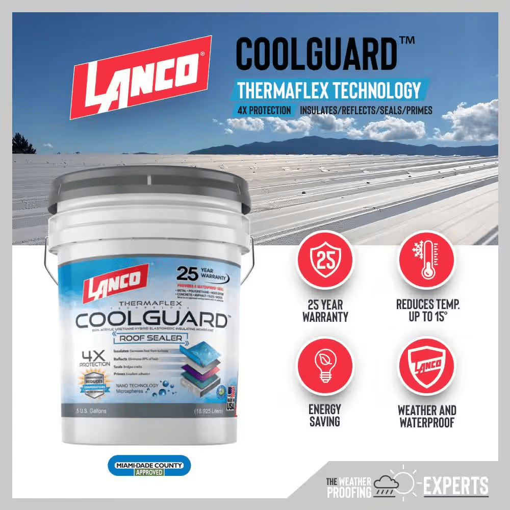 Coolguard is a powerful, high performance 100% acrylic elastomeric roof sealer that uses Thermaflex technology to significantly reduce interior temperatures. The Thermaflex formula contains tiny insulating micro-spheres that dramatically increase in size as the temperature of the sealer rises, which prevents heat from being absorbed by the surface. This single-component acrylic urethane product reflects UV rays to reduce heat and provides a single monolithic layer that waterproofs and insulates the surface. It applies and dries ultra-white.