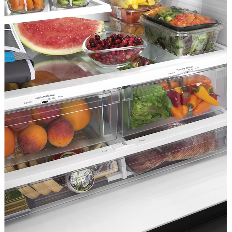 - Two humidity-controlled drawers and full-width drawer – create the right environment for keeping fruits and vegetables fresh, while easily storing wider items like a party platter or a sheet cake
