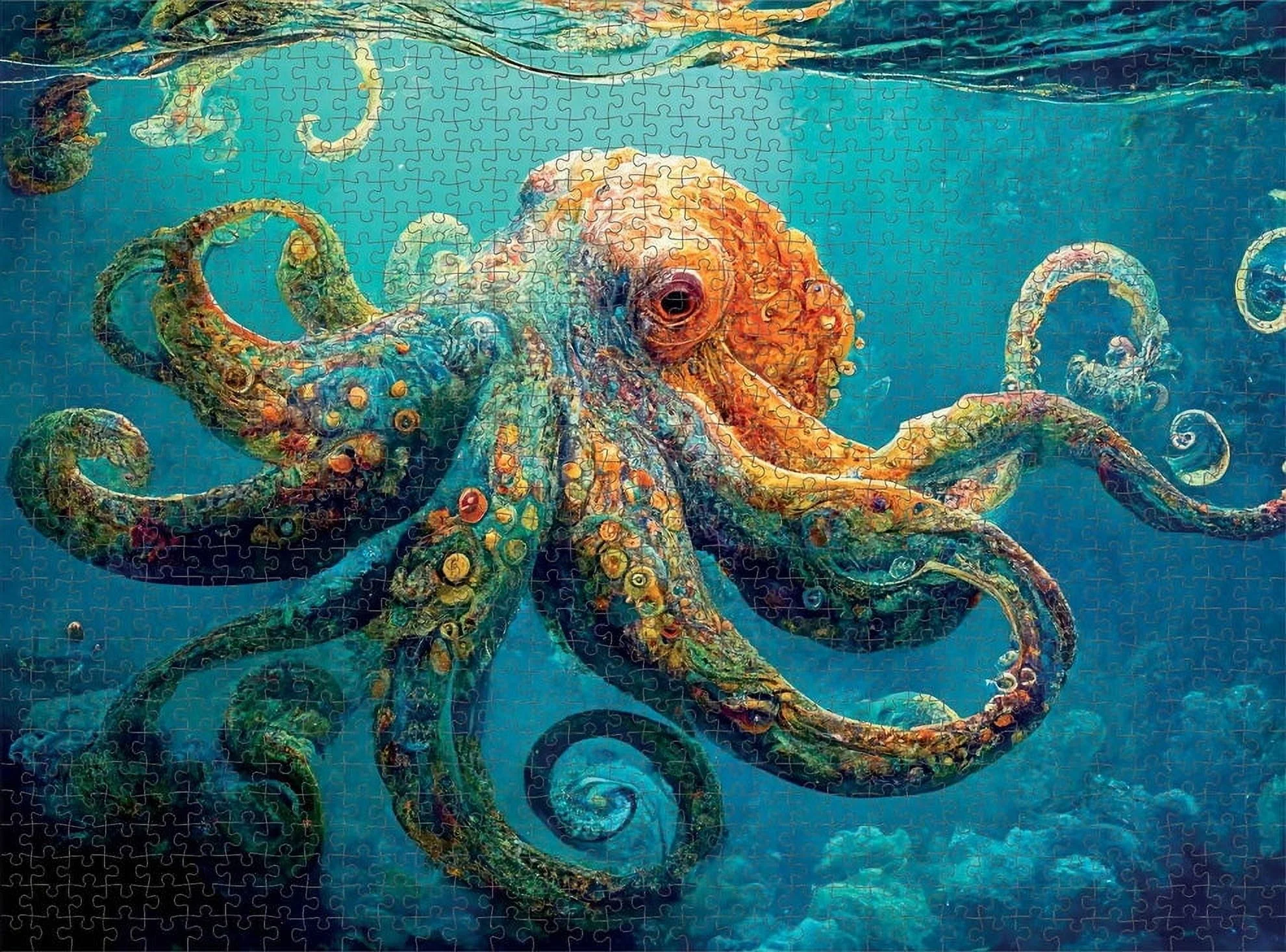 - Welcome to the “Deep Blue Octopus Odyssey, “your ticket to a grand, underwater expedition, masterfully captured in a 1000-piece jigsaw puzzle. Prepare to witness the enigmatic beauty of an illustrious octopus, its radiant orange body contrasting with the hypnotic blues of the vast ocean. This is not just a puzzle. This is a journey into the heart of the ocean, a testament to nature’s grandeur and a true test of your puzzle-solving prowess.