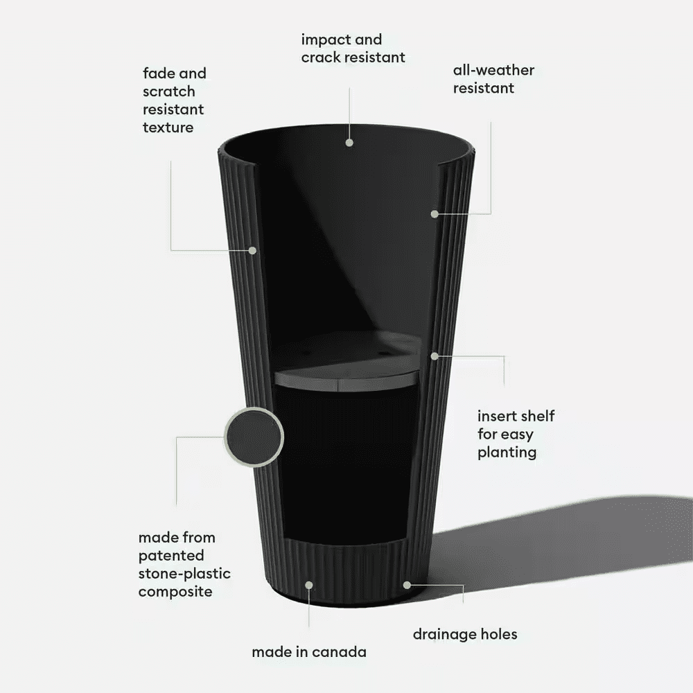 Minimal design and modern appeal. With softened, fluted lines in all the right places, the Demi tall planter is the perfect all-season flower pot for nearly any plant in any space, whether indoors waiting to greet your guests at the foyer or out on the front porch. With a removable insert shelf, you can save soil or easily change your plant arrangements. Made from a patented, heavy-duty concrete-plastic composite, Demi planters have the look of concrete, while still maintaining the durable, impact-resistant performance of plastic. All Demi planters are crack-resistant and are specially treated with UV inhibitors to prevent fading. These Veradek planters are designed and made in Canada, so you can rest assured you are receiving the highest quality of planters that’ll last all year round.